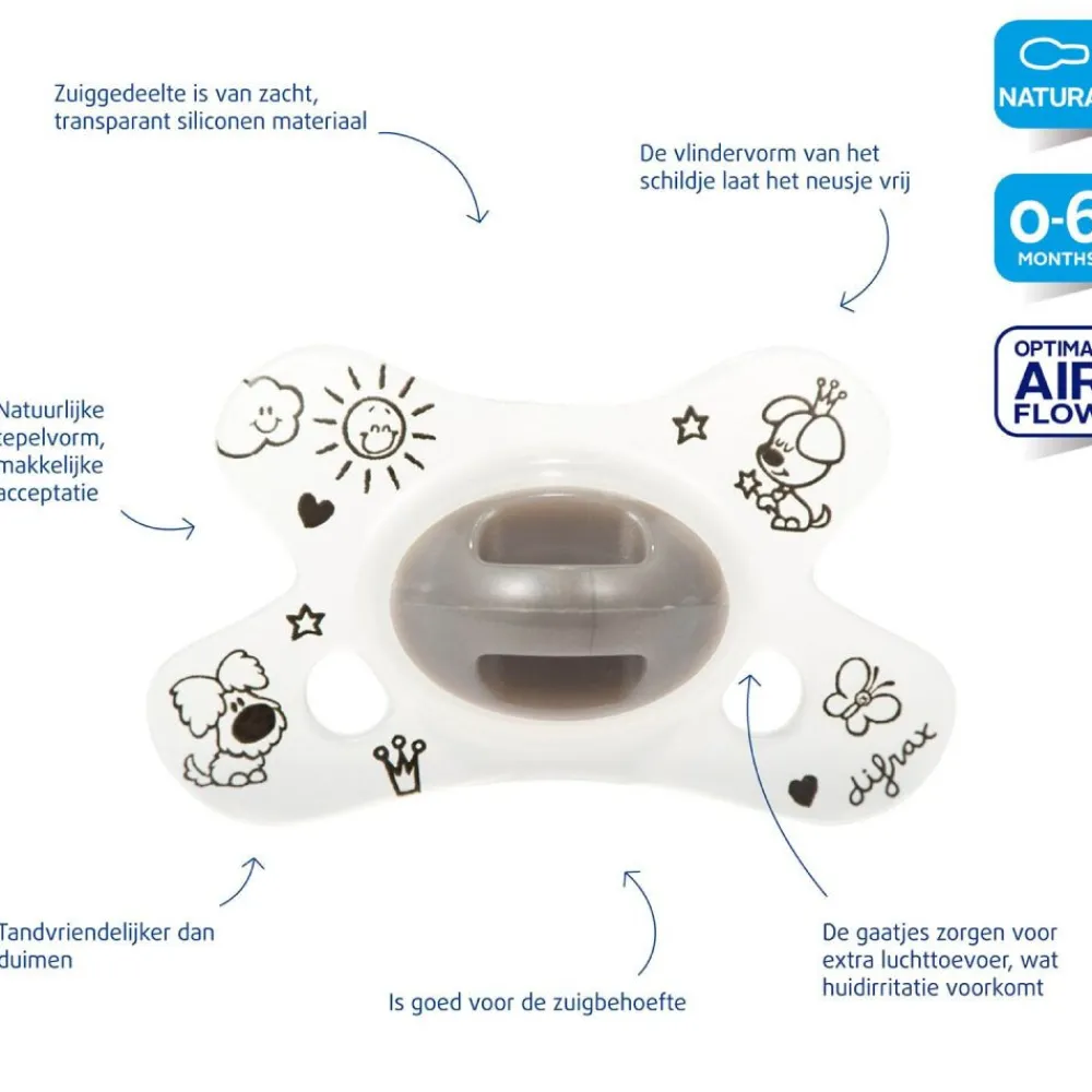 Een fopspeen kan je kindje troosten, laat je kindje ontspannen en voorziet in de zuigbehoefte van baby’s. De Difrax Fopspeen Natural is symmetrisch van vorm zodat je kindje deze herkent en makkelijker zal accepteren. De speen is gemaakt van zacht, BPA-vrij materiaal. De fopspeen heeft een vlindervormig schildje die het neusje vrij laat zodat je baby makkelijk kan ademhalen door de neus. Gaatjes in het schildje zorgen voor extra luchttoevoer en voorkomen zo huidirritatie. De grootte van het speengedeelte en het schildje zijn speciaal ontworpen voor baby’s van 0-6 maanden. De Difrax Natural Fopspenen zijn in vele maten en trendy prints verkrijgbaar.