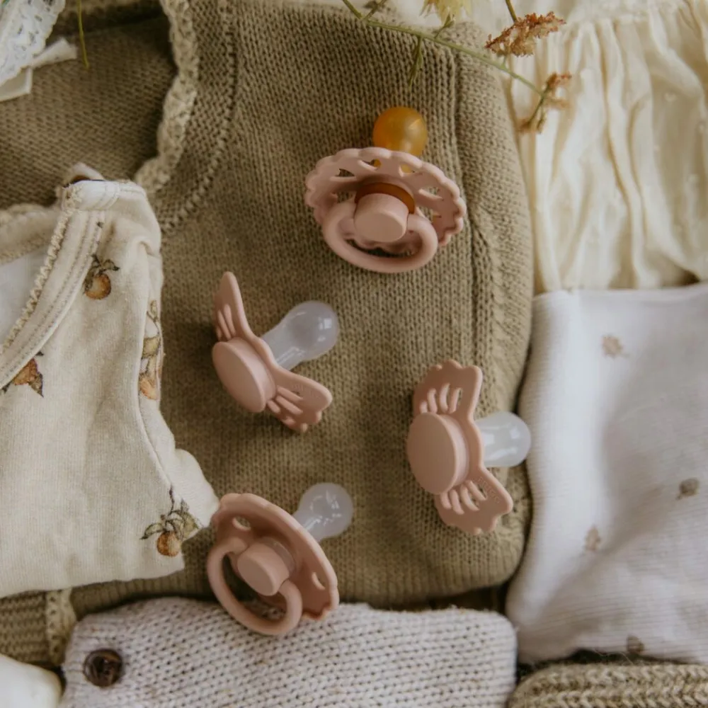 Voor nieuwe ouders kan het moeilijk zijn om uit te vinden welke fopspeen het beste is voor hun kleintje. Met de ‘Baby’s eerste fopspeen’-set van FRIGG, bestaande uit 4 verschillende FRIGG fopspenen met verschillende materialen en vormen fopspenen, kunnen ouders verschillende fopspenen uitproberen om erachter te komen welke fopspeen hun baby het prettigst vindt.