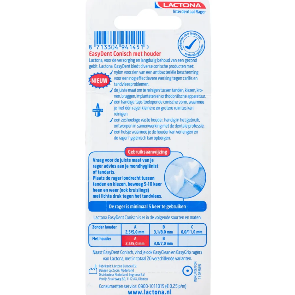 Lactona EasyGrip Ragers A Wit 2.5-5 mm zijn ontworpen voor grondige en comfortabele reiniging tussen tanden en kiezen. De ergonomische zeshoekige grip zorgt voor optimale controle en ligt prettig in de hand. Voor beter bereik achter in de mond plaats je eenvoudig de dop op de achterkant van de grip. Handig en hygiënisch, ook voor onderweg. De rager heeft zachte, antibacteriële nylon haren en een kunststof gecoat ijzerdraad dat extra bescherming biedt aan tanden en tandvlees. Geschikt voor dagelijks gebruik, ook bij kronen, bruggen, implantaten en vaste beugels.
