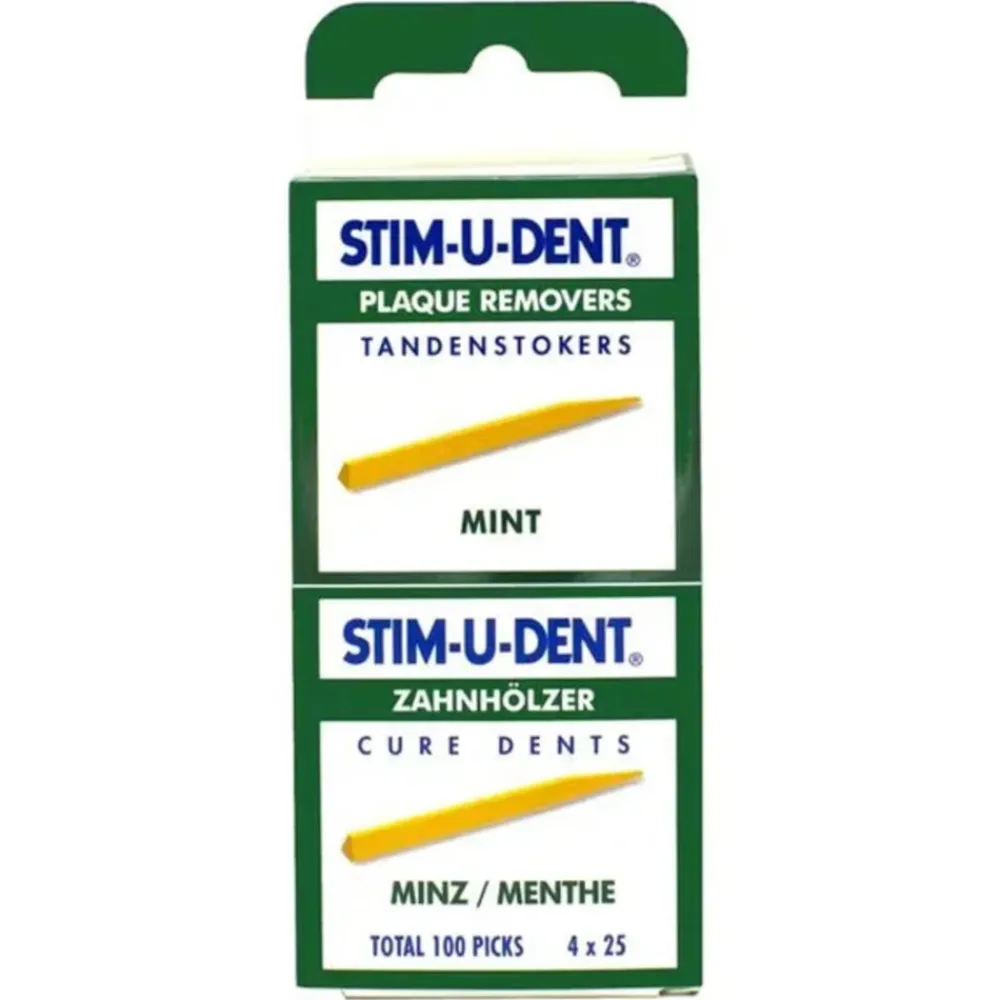 De Stim-U-Dent tandenstokers Mint hebben een speciale driehoekige vorm en zijn gemaakt van de bast van de Amerikaanse Lindeboom, een zacht maar sterk en buigzaam soort hout. Zacht en dus veilig voor plakverwijdering tussen de tanden en kiezen. Omdat de tandenstoker zacht en buigzaam is, kan zij van vorm veranderen en zich nog beter aanpassen aan de te reinigen ruimtes. Stim-U-Dent wordt vanwege haar kwaliteit en klinisch bewezen resultaat, aanbevolen door tandartsen. De Stimudent tandenstokers zijn makkelijk in het gebruik en bereiken delen van het gebit waar de tandenborstel niet komt. Stoken is een dagelijkse aanvulling op het tandenpoetsen, het verwijdert tandplak en voedselresten, masseert het tandvlees en voorkomt tandverlies. Stoken werkt beter dan flossen en zorgt voor gezond tandvlees en een schoon en fris gebit. Het product is verkrijgbaar in een 4-pak verpakking van 4×40 stuks (dus in totaal 160 tandenstokers per verpakking). De tandenstokers hebben een mint smaak. Gebruiksaanwijzing: 1. Vóór gebruik in de mond bevochtigen. 2. Plaats de stoker tussen de tanden met de smalle, platte zijde tegen het tandvlees. 3. Reinig de tanden en masseer het tandvlees door rustig heen en weer te bewegen.