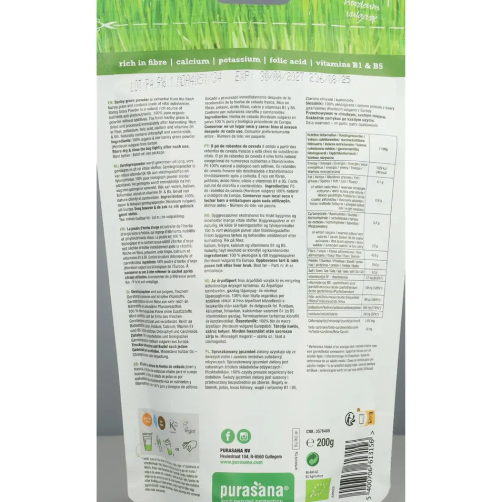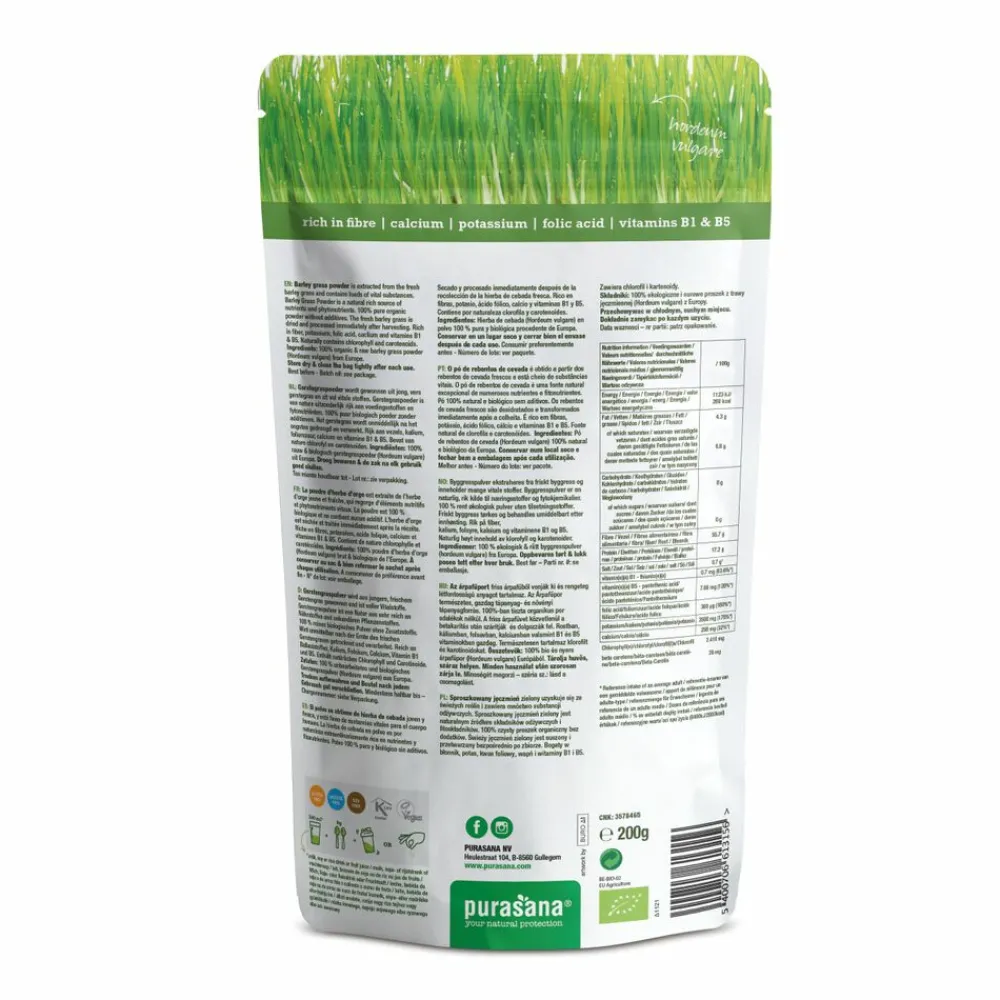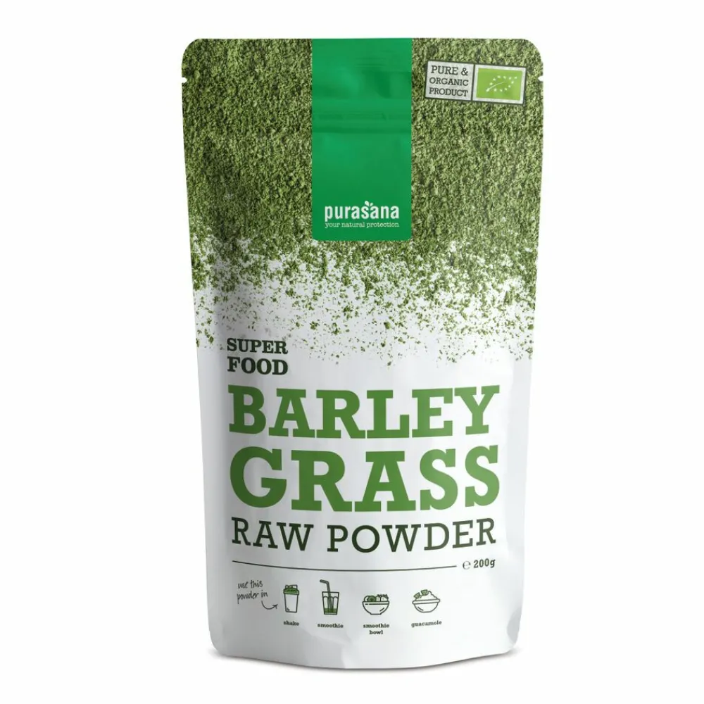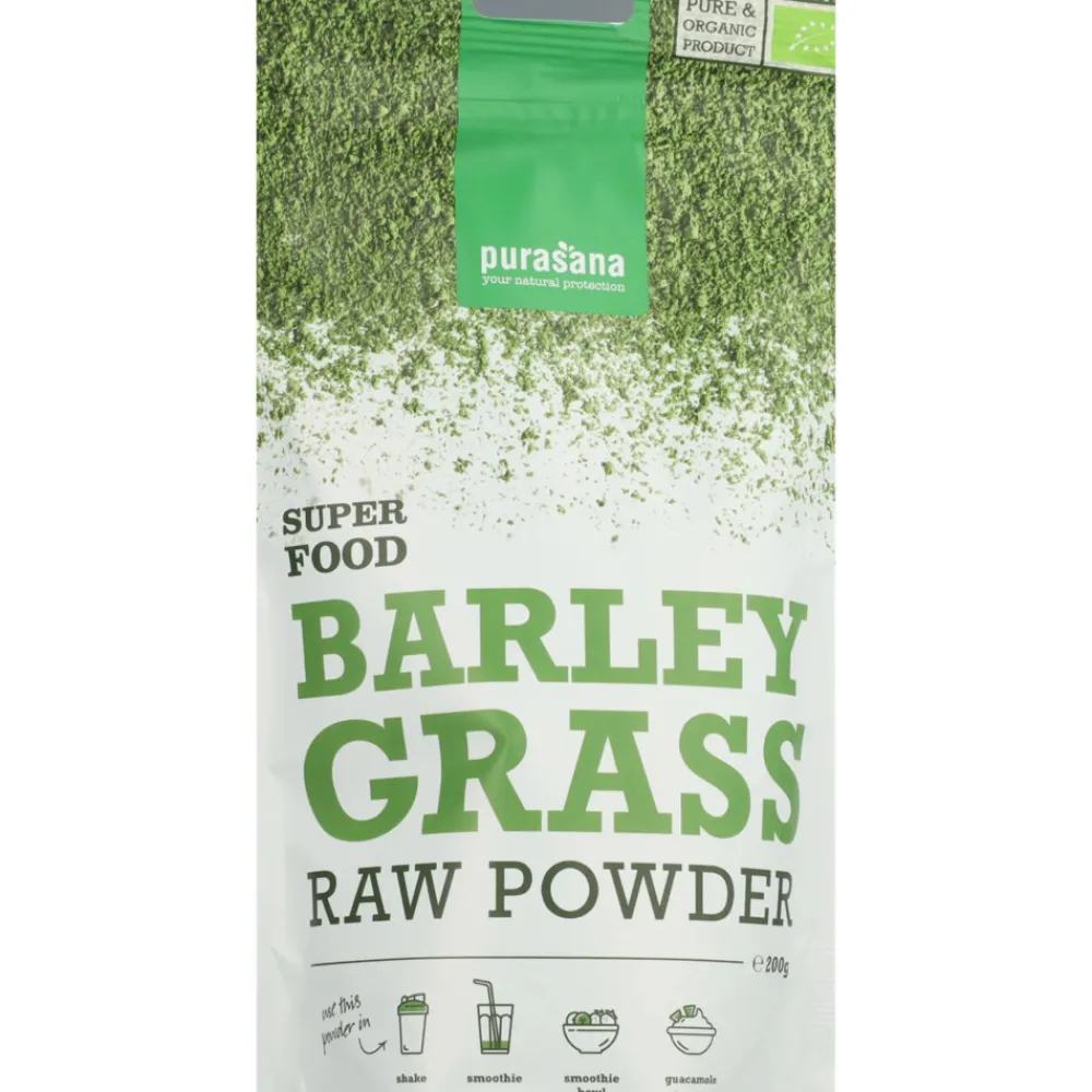 Purasana Barley Grass poeder wordt gewonnen uit jong, vers gerstegras. Na het oogsten wordt het gelijk gedroogd en verwerkt. Hierdoor is het 100% puur, raw en biologisch poeder zonder toevoegingen. Gerstegras poeder is van nature rijk aan vitaminen, mineralen, eiwitten, vezels, chlorofyl (bladgroen) en carotenoiden. Gerstegras poeder is een van de meest effectieve middelen om de PHwaarde van je lichaam in balans te brengen en het verhoogt je energieniveau*.
