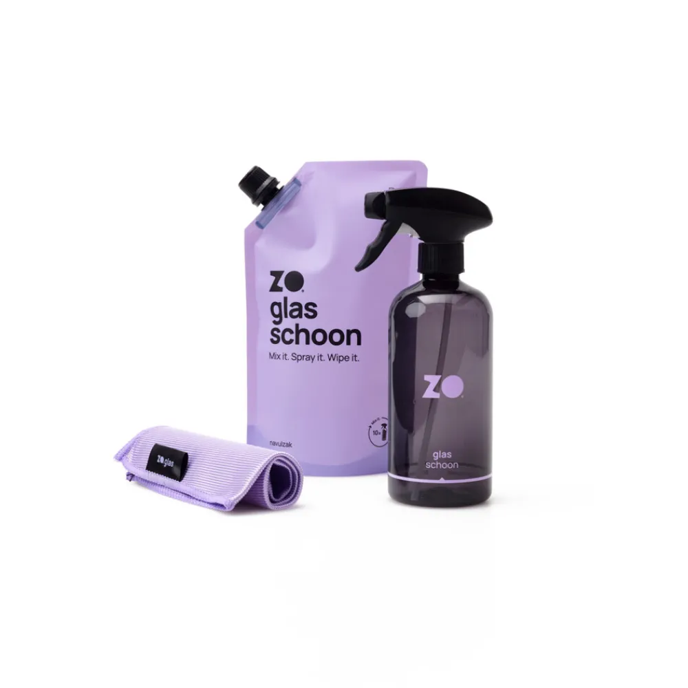 Met het ZO glas schoon startpakket wordt ramen wassen een fluitje van een cent. Dit energieke en deskundige pakket bevat alles wat je nodig hebt voor een sprankelend resultaat. Geen strepen, geen gedoe! Met ZO glas schoon en de ZO glasdoek maak je spiegels, ramen en beeldschermen streeploos schoon. Dankzij de handzame sprayer ook ideaal voor de auto en de caravan. Natuurlijk zonder ammonia, spiritus of andere schadelijke stoffen.