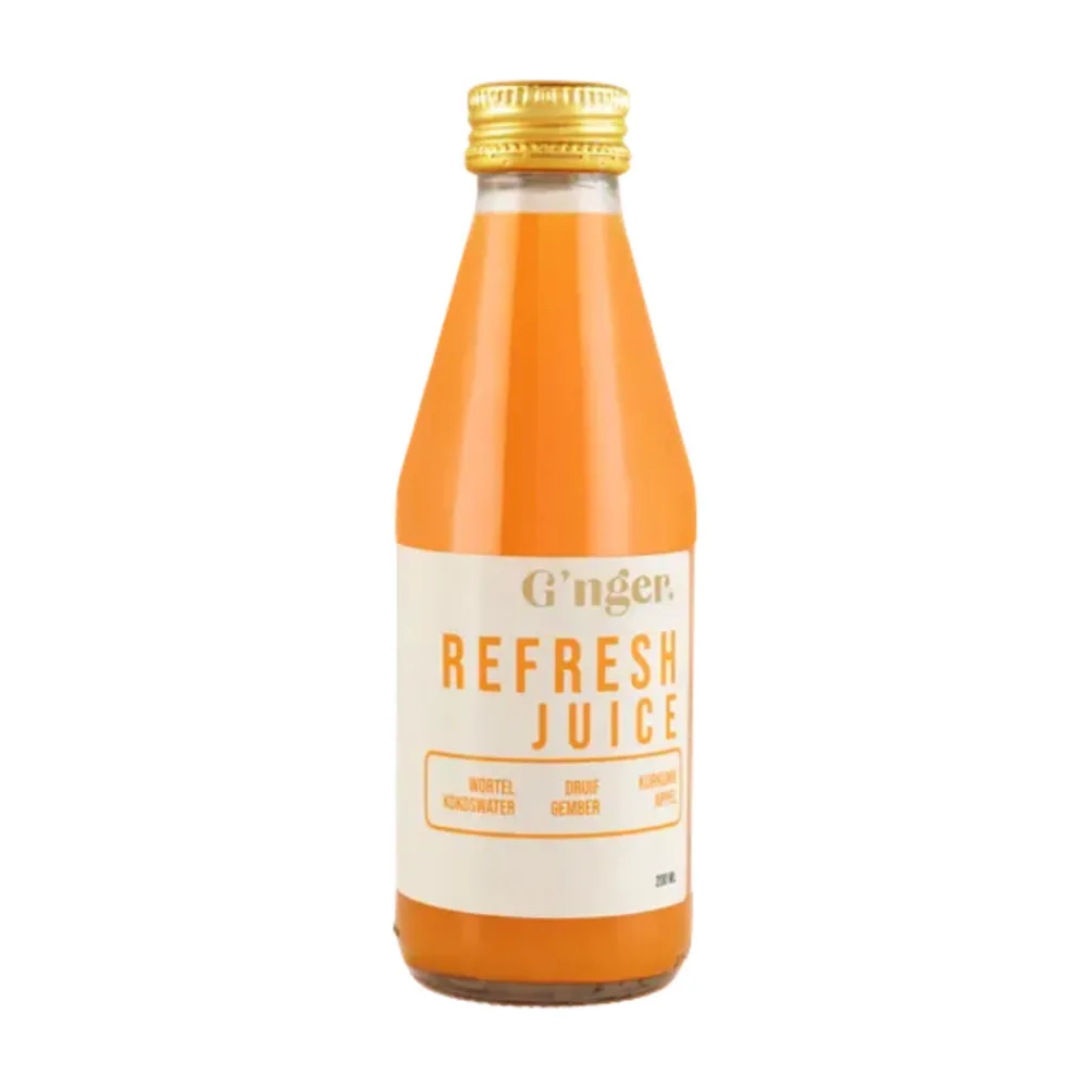 G’nger Juice Biologisch Refresh is een harmonieuze mix van zachte wortel, hydraterend kokoswater, fruitige witte druiven en een warme toets van gember en kurkuma. Deze unieke combinatie levert een verkwikkend sap op dat zowel mild als pittig is. De natuurlijke zoetheid van druiven en wortel vloeit naadloos samen met de frisheid van kokoswater, terwijl gember en kurkuma zorgen voor een verfijnde kruidige afdronk. Ideaal als oppepper op elk moment van de dag.