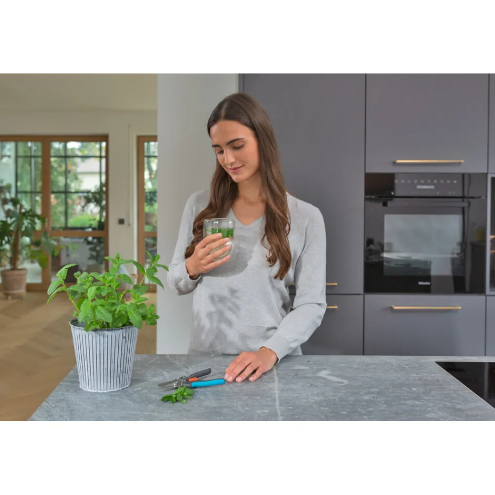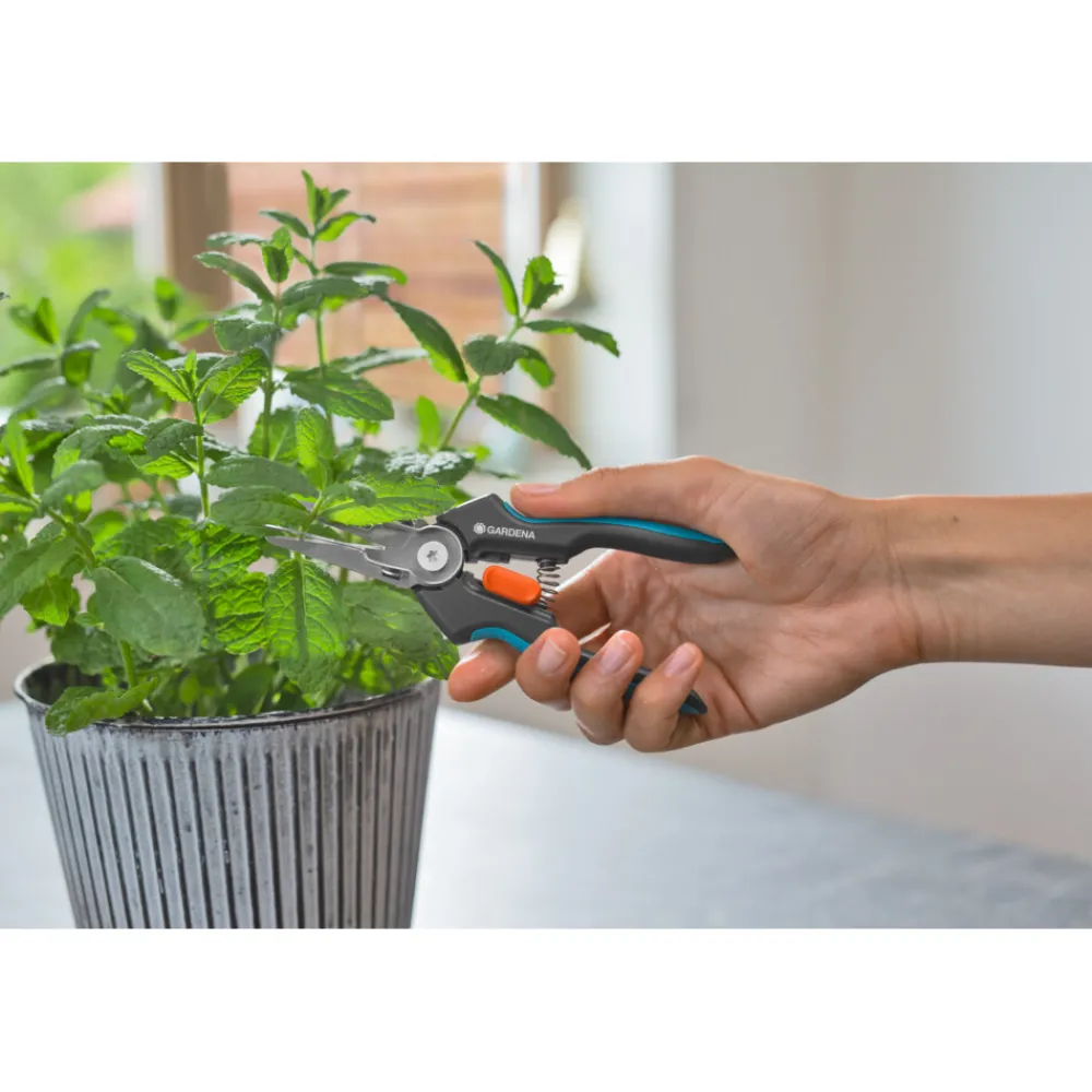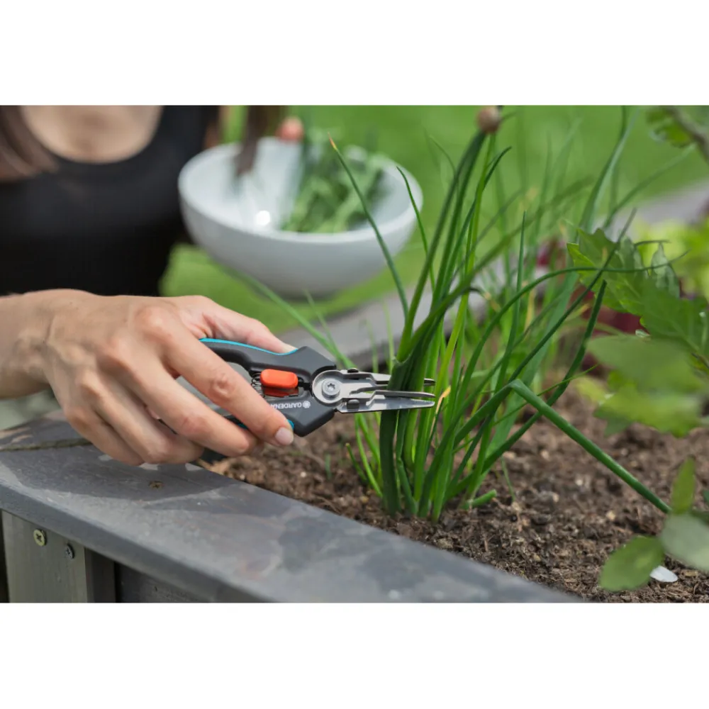 De GripCut van Gardena heeft een grijper, waarmee je tegelijkertijd kan knippen en grijpen met slechts één hand, dankzij de ingebouwde grijpfunctie. De veelzijdigheid van de GripCut is erg handig: knip verse kruiden zoals een takje peterselie of bieslook en hou ze daarna meteen goed vast. Pepers oogsten wordt bijzonder makkelijk gemaakt en er komt geen pittig sap op je vingers. Je laat je oogst niet vallen en hebt bovendien een hand vrij om een kom of zeef vast te houden, waardoor je niet de hele tijd hoeft te bukken om dingen in een houder op de grond te leggen. De hoge kwaliteit en duurzaamheid van de roestvrijstalen messen zijn bij het knippen erg overtuigend. Met de scherpe messen kan je erg netjes en nauwkeurig knippen, tot aan het puntje. Dankzij de ergonomische ErgoTec-handgrepen met zachte onderdelen, past de oogstschaar perfect in je hand en is hij slipvast. Het eenhandig vergrendelingsmechanisme helpt je veilig de GripCut te sluiten om hem op te bergen. De messen zijn voedselveilig en laten geen smaak of geur achter. Om hem schoon te maken demonteer je eerst de grijper en leg je hem daarna in de afwasmachine, samen met de GripCut. Gardena benadrukt de hoge kwaliteit van de GripCut door er 25 jaar fabrieksgarantie op te geven, na registratie op Gardena.com/registration binnen 3 maanden na aankoop. Ga voorzichtig om met het product. Gardena Micro-Cutting. Geef je oogst de respect die het verdient, met ons assortiment precisiegereedschappen.