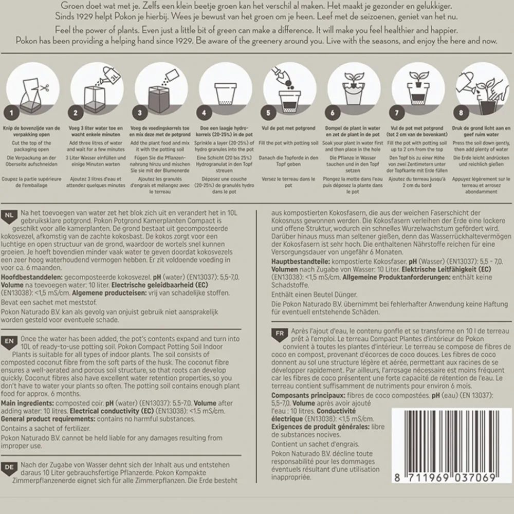 Na het toevoegen van water zet het blok zich uit en verandert het in 10L gebruiksklare potgrond. Pokon Potgrond Kamerplanten Compact is geschikt voor alle kamerplanten. De grond bestaat uit gecomposteerde kokosvezel, afkomstig van de zachte kokosbast. De kokos zorgt voor een luchtige open structuur van de grond, waardoor de wortels snel kunnen groeien. Je hoeft bovendien minder vaak water te geven doordat kokosvezels een zeer hoog waterhoudend vermogen hebben. Er zit voldoende voeding in voor ca. 6 maanden.