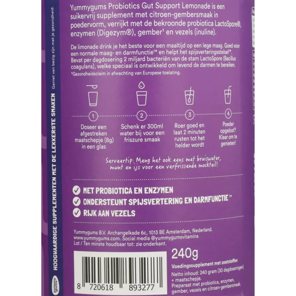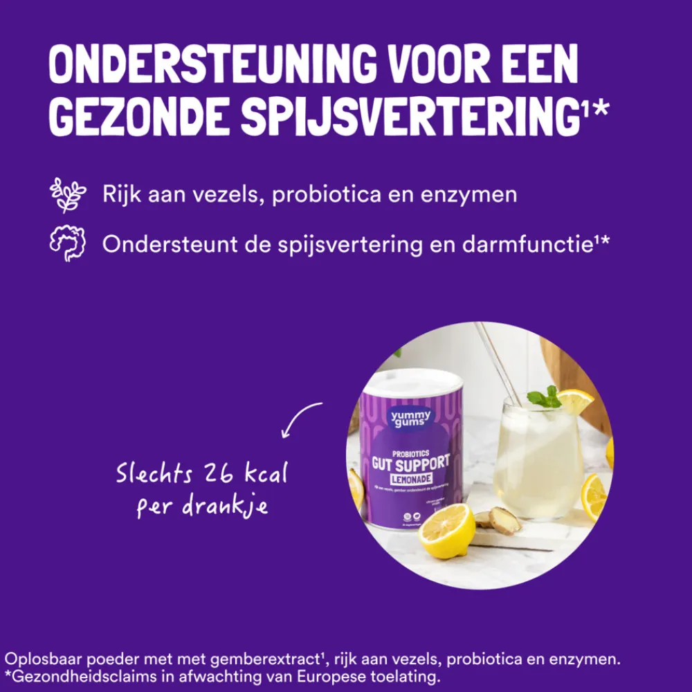 Yummygums Gut Support Lemonade is een suikervrij supplement in poedervorm met de goed opneembare vorm van probiotica LactoSpore®. Gut Support Lemonade is speciaal ontwikkeld ter ondersteuning van de spijsvertering en darmfunctie¹*, het is makkelijk oplosbaar, vrij van allergenen en bevat geen kunstmatige kleur- en smaakstoffen. Ondersteun je spijsvertering op natuurlijke wijze met deze veganistische blend, verrijkt met de bekroonde probiotica LactoSpore®, enzymen (Digezym®), glutamine en inuline (vezels).