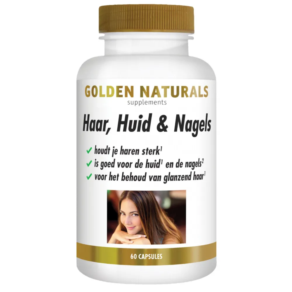 Golden Naturals Haar, Huid & Nagels is een voedingssupplement met maar liefst 23 ingrediënten. Eén van de bestanddelen is biologisch beschikbare keratine: Cynatine® HNS. Golden Naturals Haar, Huid & Nagels bevat daarnaast vitaminen, kruidenextracten en natuurlijke bouwstoffen. Biotine, heermoes en selenium dragen bij aan normale haargroei* en houden de haren sterk*. Biotine is ook goed voor het behoud van glanzend haar. Heermoes is eveneens belangrijk voor huid en nagels*. Vitamine B2 en biotine ondersteunen het herstellend vermogen van de huid. Selenium is goed voor het behoud van normale nagels en vitamine B6 draagt bij aan een normale hormoonbalans.