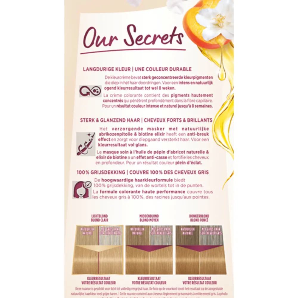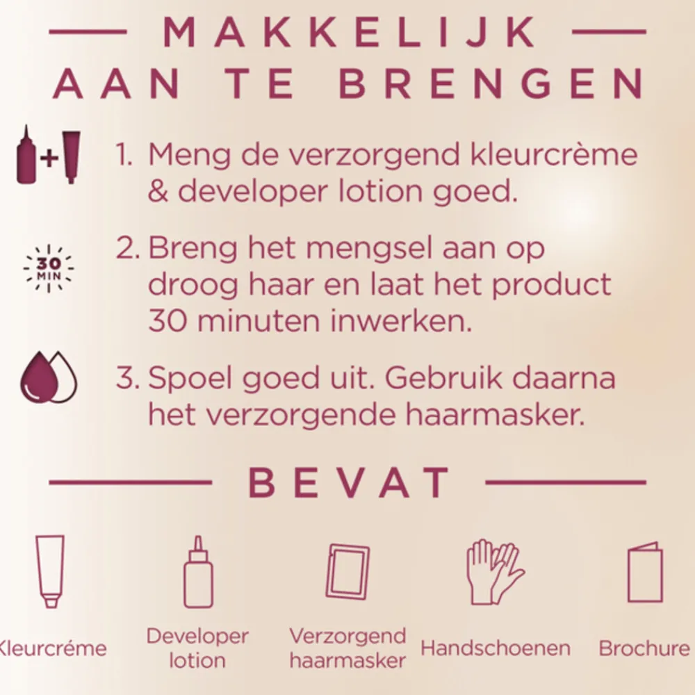 KLEURCRÈME: Aqua (Water, Eau), Cetearyl Alcohol, Ammonium Hydroxide, Glyceryl Stearate SE, Prunus Amygdalus Dulcis (Sweet Almond) Oil, Ceteareth-20, Octyldodecanol, Sodium Laureth Sulfate, Sodium Cetearyl Sulfate, Parfum (Fragrance), Toluene-2,5-Diamine Sulfate, Oleic Acid, Glycerin, Sodium Sulfite, Ethanolamine, Resorcinol, Etidronic Acid, Carbomer, Potassium Hydroxide, Linalool, Serine, 2-Amino-6-Chloro-4-Nitrophenol, 2-Methylresorcinol, Sodium Sulfate, 2-Amino-3-Hydroxypyridine, Geraniol, Citronellol, Limonene, Benzoic Acid, m-Aminophenol, Benzyl Alcohol., ONTWIKKELEMULSIE: Aqua (Water, Eau), Hydrogen Peroxide, Cetearyl Alcohol, PEG-40 Castor Oil, Etidronic Acid, Sodium Cetearyl Sulfate, Potassium Hydroxide, 2,6-Dicarboxypyridine, Disodium Pyrophosphate, Sodium Benzoate., VERZORGENDE CONDITIONER: Aqua (Water, Eau), Cetearyl Alcohol, Quaternium-87, Stearamidopropyl Dimethylamine, Dimethicone, Distearoylethyl Hydroxyethylmonium Methosulfate, Isopropyl Myristate, Biotin, Paeonia Lactiflora Root Extract, Amodimethicone/Morpholinomethyl Silsesquioxane Copolymer, Hydrolyzed Keratin, Citric Acid, Glycerin, Prunus Armeniaca (Apricot) Kernel Oil, Dicaprylyl Carbonate, Propylene Glycol, Dimethiconol, Potassium Sorbate, Phenoxyethanol, Polyquaternium-37, Trideceth-5, Sodium Methylparaben, Parfum (Fragrance), Linalool, Benzyl Salicylate, Limonene, Benzyl Alcohol. Bevat waterstofperoxide, fenyleendiarinen (tolueendiaminen) en resorcinol.