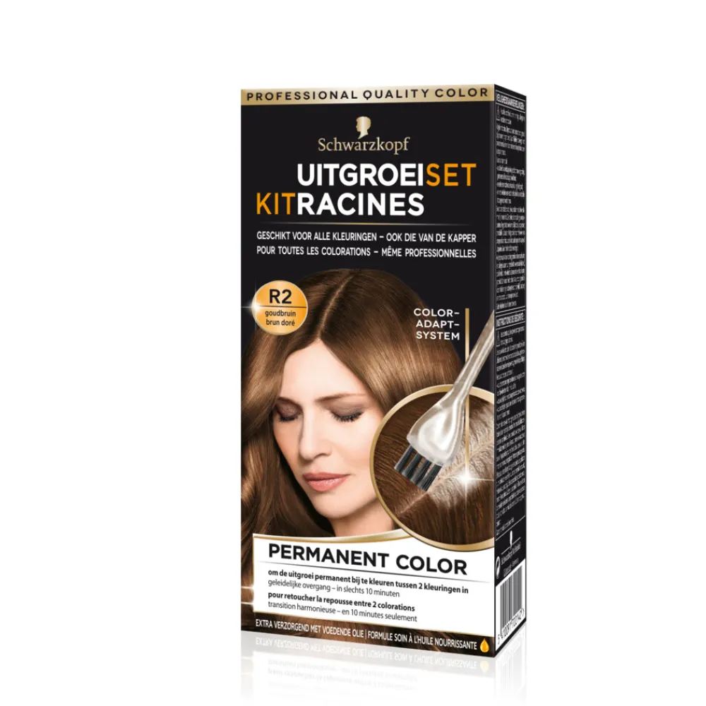 Ontdek de makkelijke manier om snel je uitgroei te behandelen tussen twee kleuringen in. Met Schwarzkopf Uitgroeiset is de uitgroei permanent bijgekleurd in slechts 10 minuten! Het unieke ‘Color-adapt-systeem’ zorgt voor een geleidelijke overgang met uw huidige haarkleur en past bij alle kleuringen, ook die van de kapper. Daarnaast bevat de formule een voedende olie om het haar extra te verzorgen.