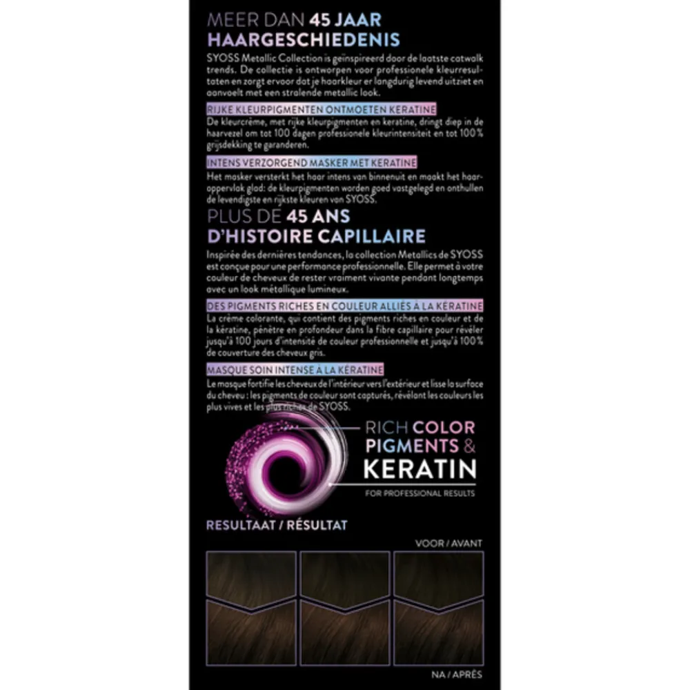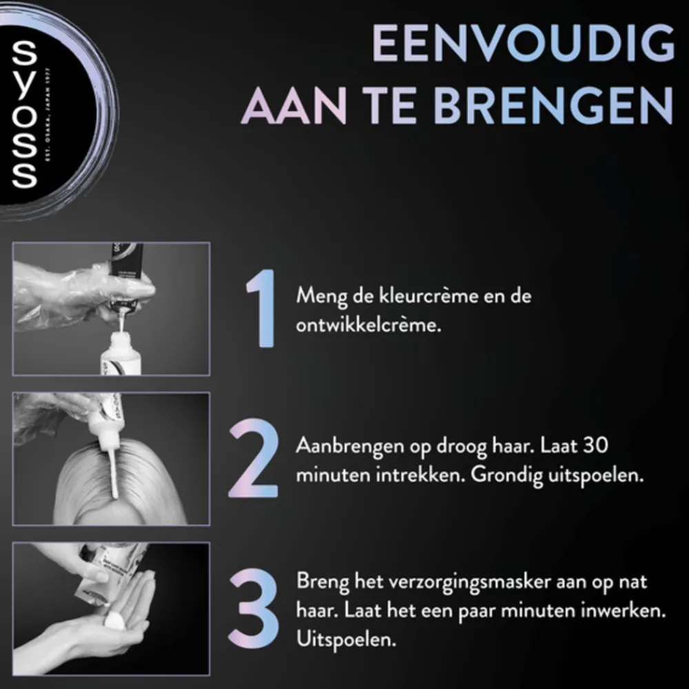 SYOSS permanente haarkleuringen, ontworpen voor professionele resultaten, zorgen ervoor dat je haarkleur er langdurig levend uitziet en aanvoelt. De kleurcrème, met rijke kleurpigmenten en keratine, dringt diep in de haarvezel om tot 100 dagen professionele kleurintensiteit en tot 100 % grijsdekking te garanderen. Het intens verzorgend masker met keratine versterkt het haar intens van binnenuit en maakt het haaroppervlak glad: de kleurpigmenten worden goed vastgelegd en onthullen de levendigste en rijkste kleuren van SYOSS.