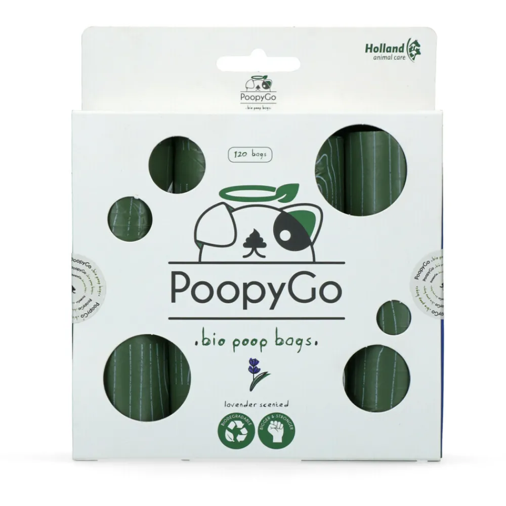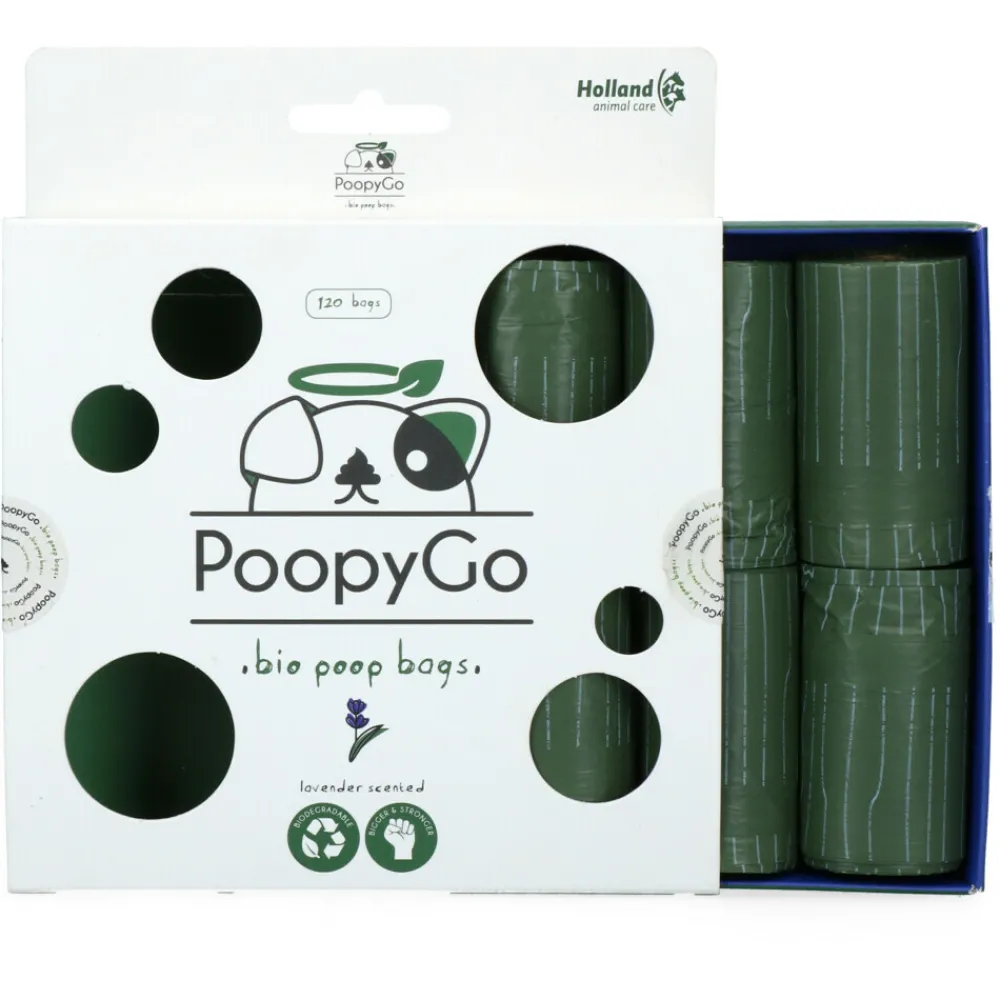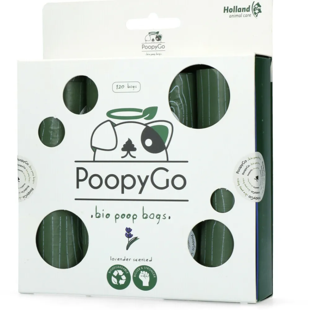 De biologisch afbreekbare PoopyGo poepzakjes: groter, sterker, beter voor het milieu en bovendien erg handig in gebruik. De poepzakjes bevatten een frisse lavendelgeur, waardoor de zakjes heerlijk ruiken. Dankzij het formaat passen ze in alle dispensers, ideaal dus om overal mee naartoe te nemen.