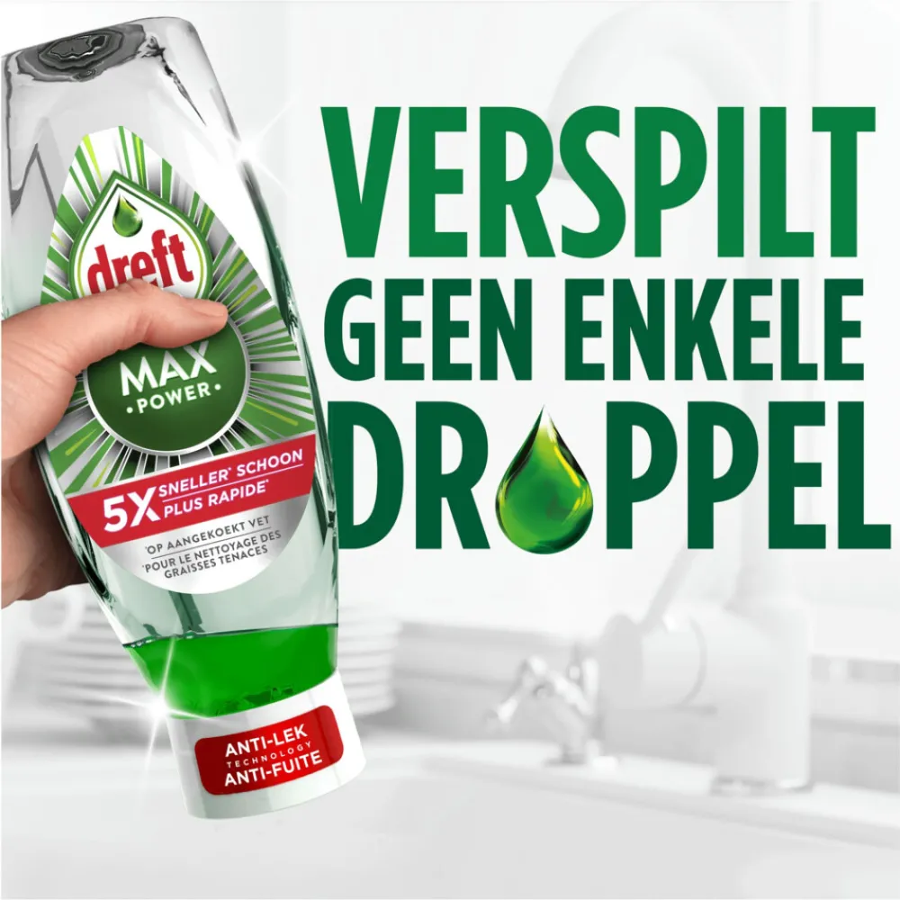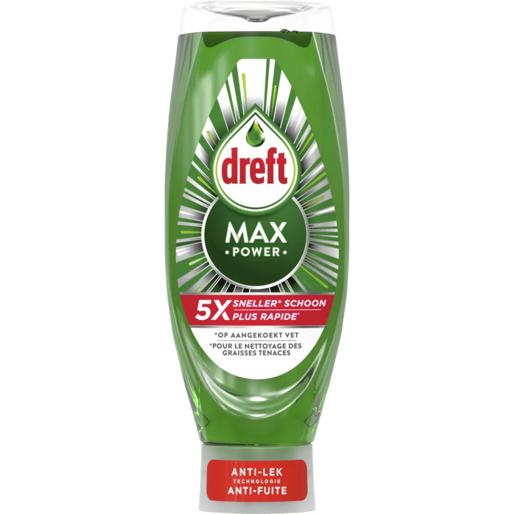 Het afwasmiddel Dreft Max Power wordt geleverd in een fles met de dop aan de onderkant voor een optimale en praktische schoonmaakervaring. Met zijn efficiëntere formule is afwassen 5x sneller op hardnekkig vet*. Gemakkelijk en moeiteloos schoonmaken, zelfs op de vetste pannen en potten. Het dringt snel door en lost hardnekkig vet op, effectief zelfs in koud water. (*5x sneller schoon op hardnekkige vetvlekken, vergeleken met verdunde imitaties)