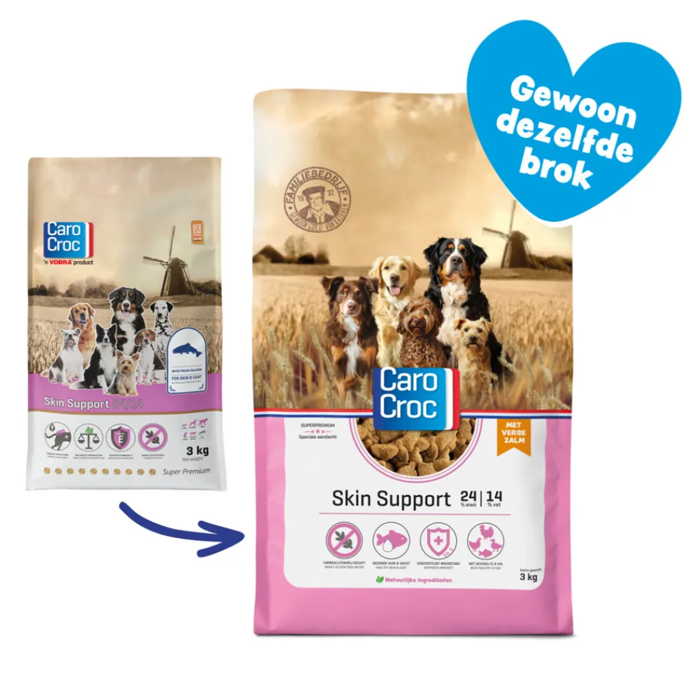 Dit hondenvoer is speciaal ontwikkeld voor honden met een gevoelige huid of een slechte conditie van de vacht. De brokken bevatten verse zalm en zalmolie welke een glanzende vacht en een gezonde huid ondersteunen. Daarnaast bevat CaroCroc Skin Support essentiële omega 3- en 6 vetzuren. Met deze toevoeging worden onder andere de weerstand, stofwisseling en vacht ondersteund. Hiernaast bevatten de brokken geen tarwegluten.
