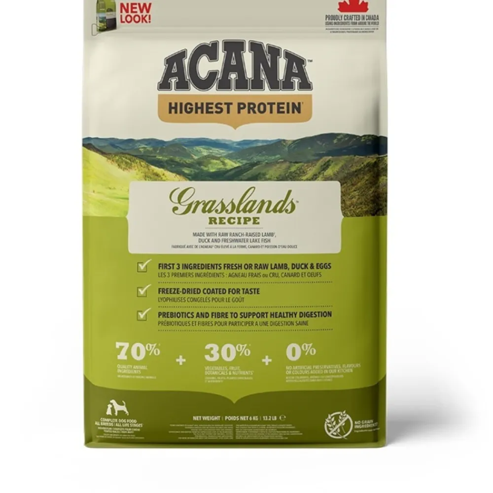 Elk ACANA ® -recept is van begin tot eind zorgvuldig samengesteld met eersteklas ingrediënten. Het ACANA Highest Protein Grasslands ® Recept , met het hoogste eiwitaanbod in ACANA-voeders voor huisdieren, is rijk aan 70% 1 hoogwaardige dierlijke ingrediënten zoals op de boerderij gekweekt 4 lamsvlees, eend, eieren en zoetwatermeervis, uitgebalanceerd met 30% 2 fruit, groenten, en plantaardige producten, waarvan er dagelijks veel worden bezorgd. In onze keuken worden nooit kunstmatige kleur-, smaak- of bewaarmiddelen toegevoegd.