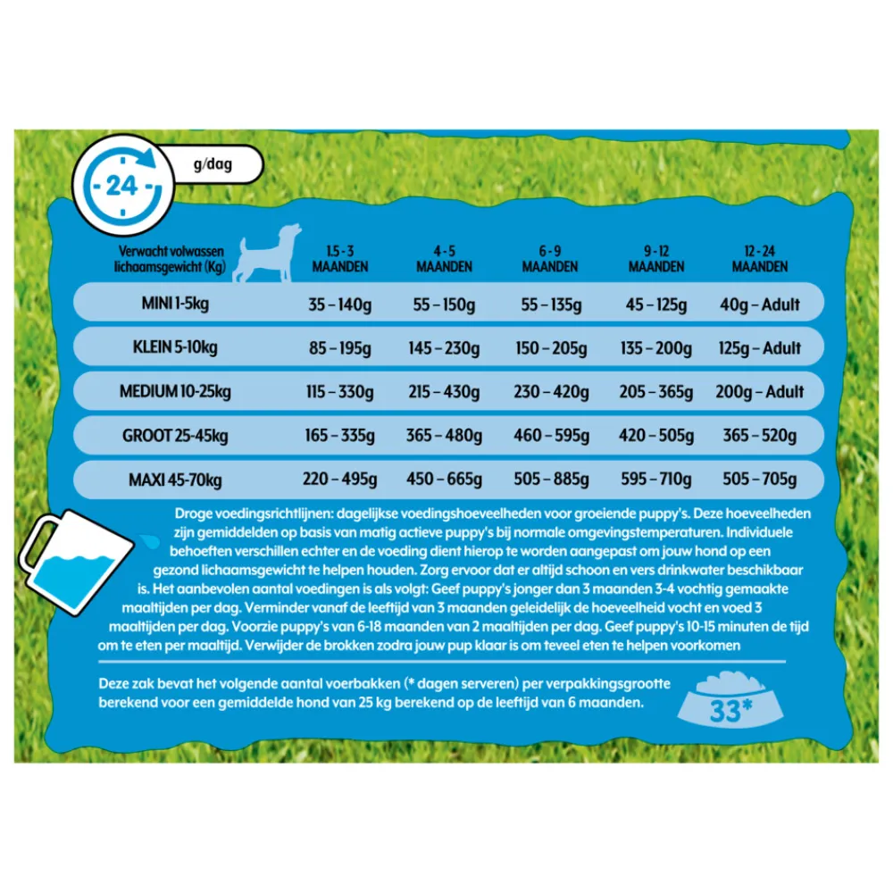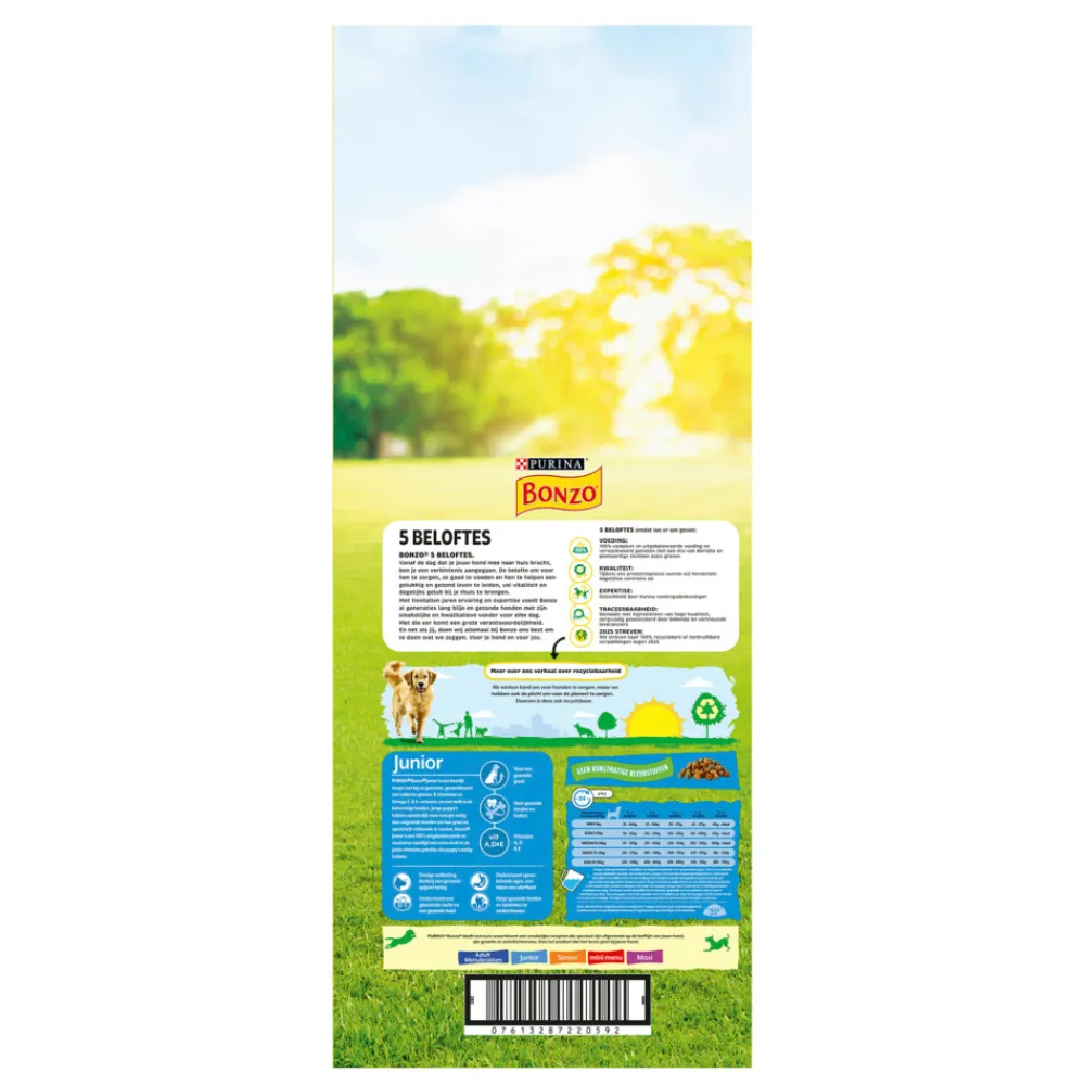 Bonzo Junior is een heerlijk recept met kip en groenten, gecombineerd met volkoren granen, B-vitaminen en Omega 3- & 6-vetzuren, en met melk in de botvormige brokjes. Jonge puppy’s hebben aanzienlijk meer energie nodig dan volgroeide honden om hun groei en speelsheid voldoende te voeden. Bonzo Junior is een 100% uitgebalanceerde en voedzame maaltijd met extra eiwit en de juiste vitamine gehaltes die puppy’s nodig hebben.