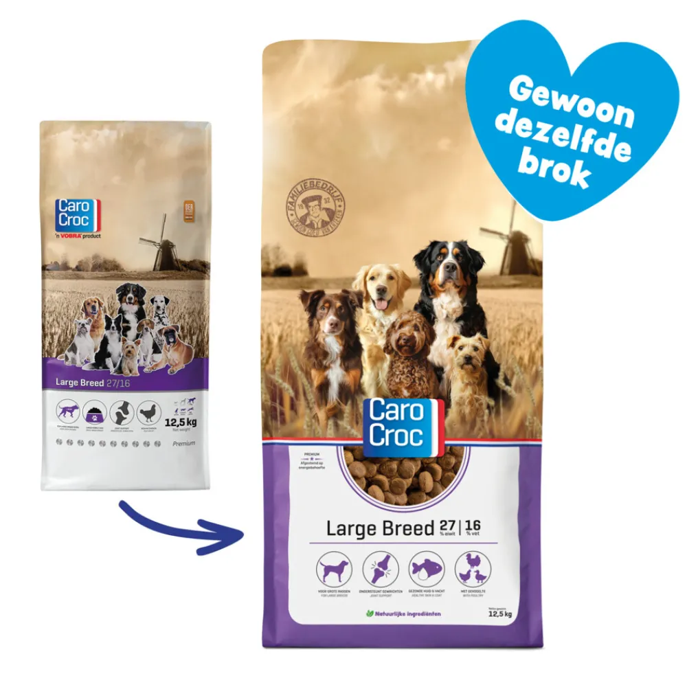Honden van grote rassen schrokken over het algemeen vaker en dat vergroot de kans op maagkanteling. CaroCroc Large Breed is een extra grote brok van 25 mm. Zo wordt het schrokgedrag van jouw viervoeter verminderd. De grote en vaak krachtige lichamen van grote honden zijn ook gevoeliger voor gewrichtsslijtage. De bestanddelen van de brokken zorgen voor een goede ondersteuning van de botten en het kraakbeen. Hiernaast bevat CaroCroc Large Breed een optimale omega-3 en -6 verhouding, wat zorgt voor een stralende huid en vacht.