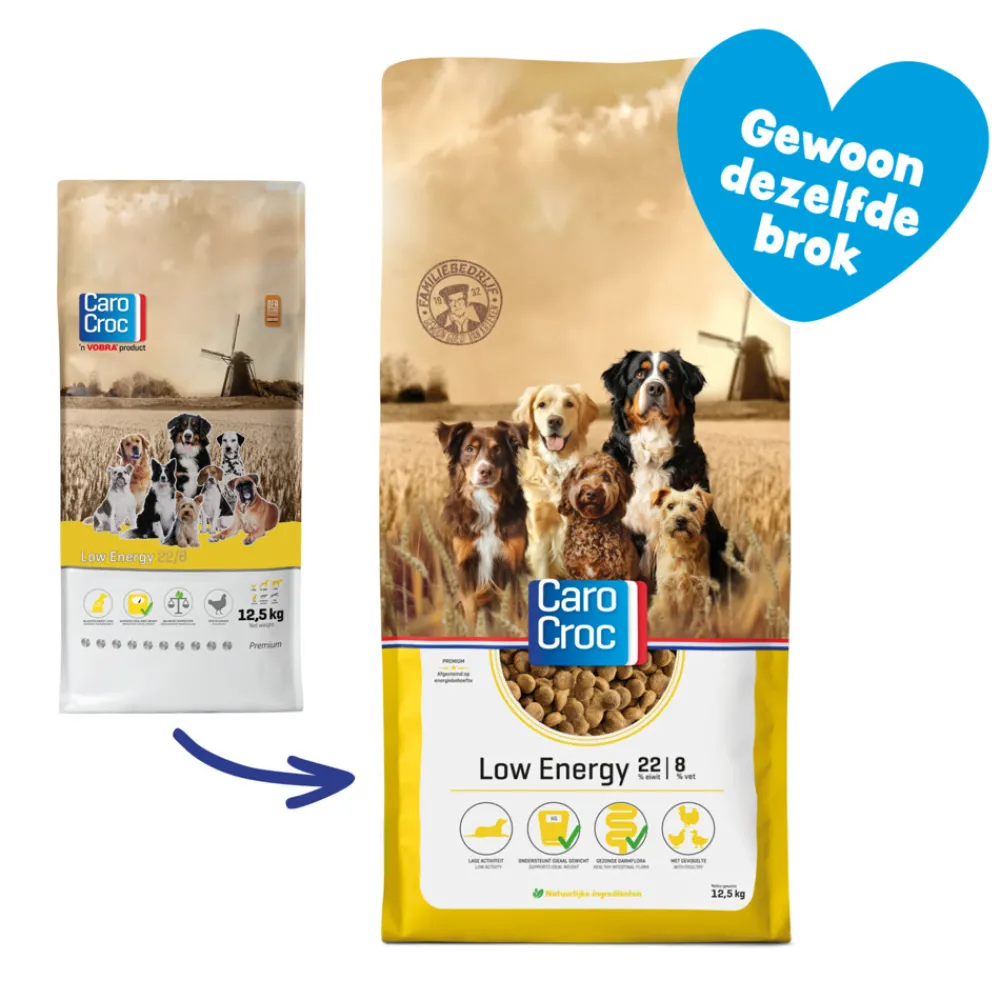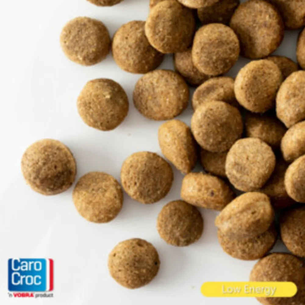 CaroCroc Low Energy is een brok voor volwassen honden met relatief weinig lichamelijke inspanning, honden die last hebben van of neigen naar overgewicht of gecastreerd/gesteriliseerd zijn.