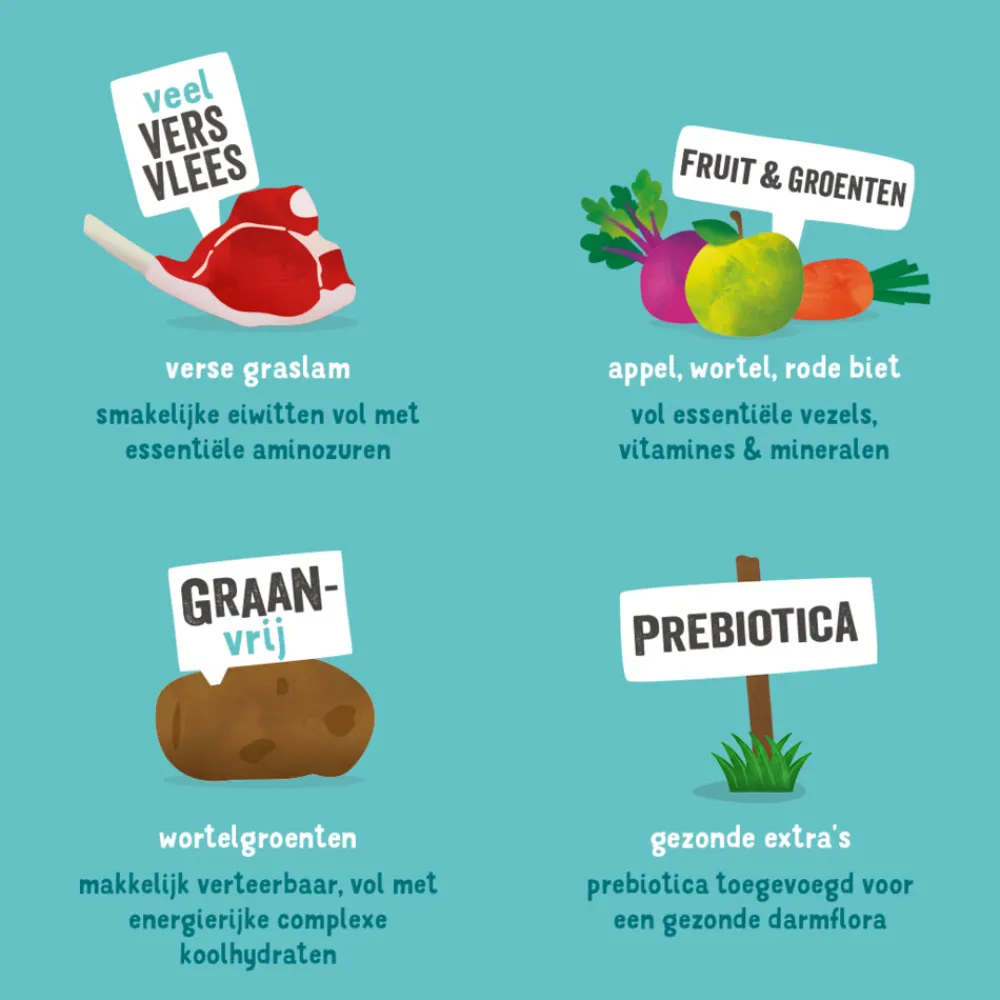 vers lam 41%, aardappelen, erwten, erwteneiwit, lijnzaad, lamssaus, zonnebloemolie, mineralen, aardappeleiwit, visolie, mannan-oligosachariden (MOS), fructo-oligosachariden (FOS), wortels 0,04%, appels 0,04%, peer 0,04%, broccoli 0,04%, banaan 0,04%, boerenkool 0,04%, spinazie 0,04%, rode bieten 0,04%, bosbessen 0,04%, goudsbloemblaadjes, brandnetel, braambesblaadjes, venkel, karwij, kamille, melisse.