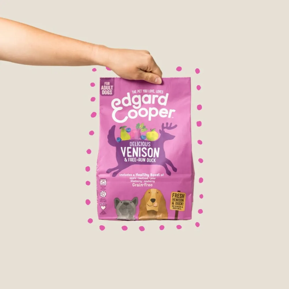 Lekkere brokken gemaakt van 100% vers vlees. Vlees een van de belangrijkste ingrediënt voor de voeding van je hond. Vers vlees zit namelijk boordevol proteïnes of eiwitten. En die zijn superbelangrijk voor een gezond leven. Vers hert kan huidirritatie bij je hond helpen verminderen. Verse scharrel eend zit vol proteïnes die de spieren behouden. Daarnaast zit het voer vol met appel, rode biet, peer en blauwe bes. Deze zitten vol met vitamines, mineralen en natuurlijke antioxidanten. De Edgard & Cooper brokjes zijn geschikt voor alle honden, groot of klein, dik of dun, jong en oud.