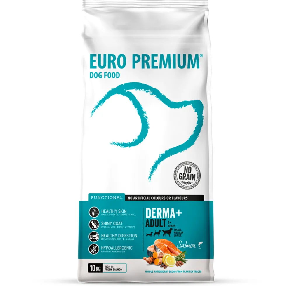Euro Premium Derma+ rijk aan verse zalm is een super-premium hondenvoeding voor een gezonde huid en vacht. Sommige honden reageren gevoelig op bepaalde ingrediënten met huidreacties tot gevolg. Deze hypoallergene receptuur is samengesteld zonder granen en bevat zalm als alternatieve, enkelvoudige dierlijke eiwitbron. Het gebruik van verse zalm bevordert de opname van dierlijke eiwitten. Zalm, samen met Antarctische krill en visolie zorgen voor een optimale hoeveelheid Omega-3 vetzuren voor een gezonde huid en vacht. Daarnaast ondersteunen Omega-6 vetzuren, zink en biotine de huid- en vacht kwaliteit. L-tyrosine intensiveert pigmentatie van de zwarte vacht. De prebiotica F.O.S., M.O.S. en β-glucanen dragen bij tot een gezonde darmflora.