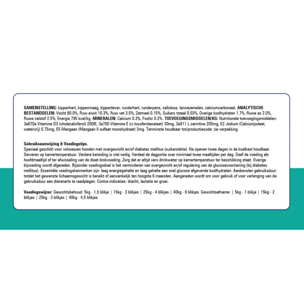 Prins NatureCare Diet Hondenvoer Nat Weight Reduction & Diabetic is speciaal ontwikkeld voor honden die kampen met overgewicht of diabetes. Dit hoogwaardige natvoer bevat zorgvuldig geselecteerde ingrediënten die bijdragen aan een gezond en gebalanceerd dieet. Met een uitgebalanceerde mix van eiwitten, vezels en essentiële voedingsstoffen, ondersteunt dit product gewichtsverlies en helpt het de bloedsuikerspiegel te reguleren. Bovendien is het voer smakelijk en goed verteerbaar, wat bijdraagt aan de algehele gezondheid en vitaliteit van jouw hond. Vertrouw op Prins NatureCare voor een wetenschappelijk onderbouwde voedingsoplossing.