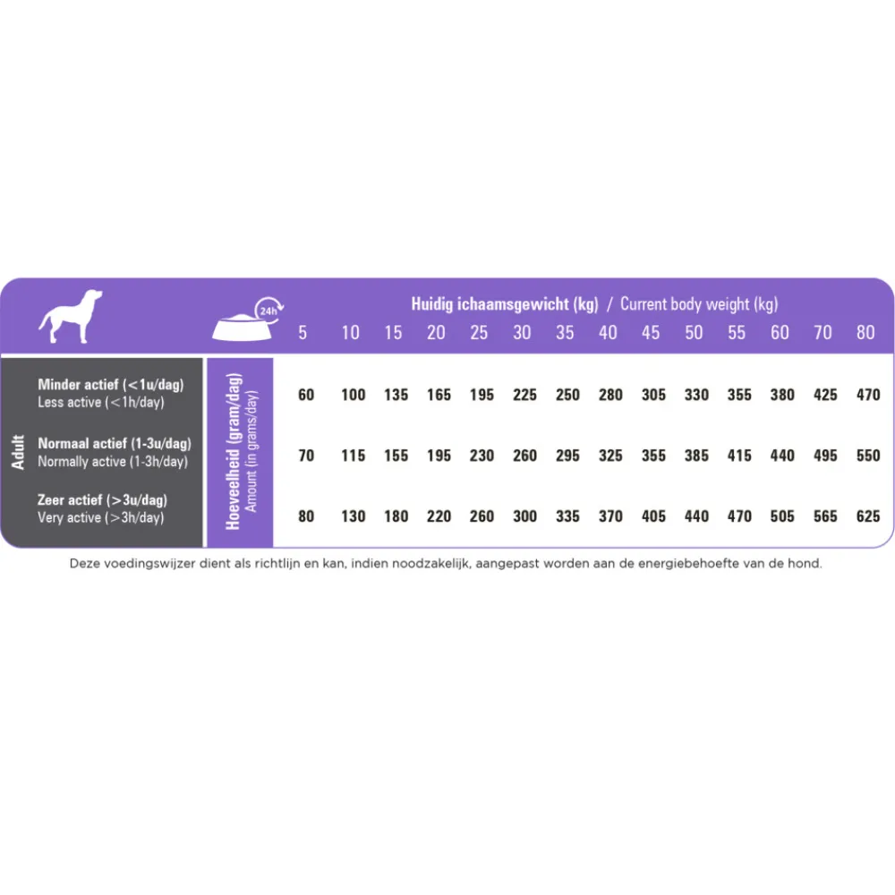 Gevogeltemeel (26,0%), tarwe, maïs, cellulose (8,8%), maïsgluten, gehydrolyseerd gevogelte eiwit (4,5%), gedroogde cichoreipulp (4,0%), rundvet, zonnebloemolie, fructo-oligosachariden (FOS) (0,5%), gehydrolyseerde gist, algenolie (0,2%).