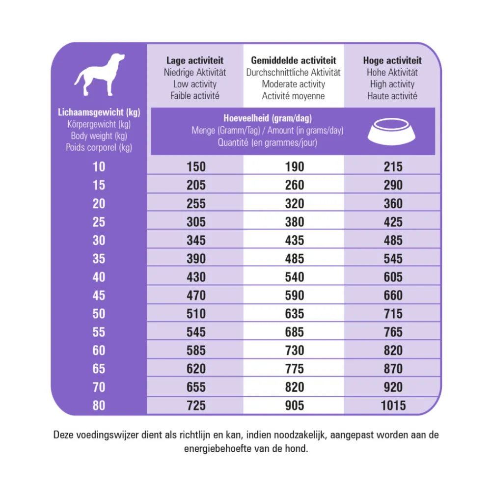 - Aangepast energiegehalte. Bevat een verlaagd vetgehalte om de hond op een gezond gewicht te houden. L-carnitine bevordert daarnaast een optimale vetverbranding.