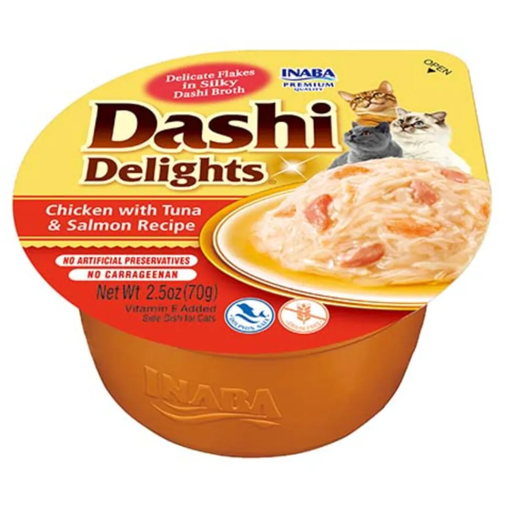 Dashi Delights Kattenvoer Chicken & Tuna & Salmon is een onweerstaanbare keuze voor jouw kat. Dit verrukkelijke natvoer bevat versnipperde tonijnvlokken, samen met smakelijke stukken kip en zalm, gekookt tot een rijke Dashi bouillon. Boordevol umami-smaak, biedt het een culinaire ervaring die jouw kat zal waarderen. Het aanvullende voer is verpakt in een kuipje, dat de versheid behoudt en elke maaltijd een smaakvolle traktatie maakt.
