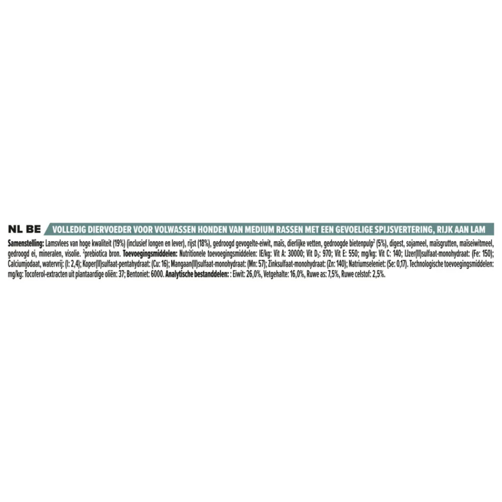 Pro Plan Adult Medium Sensitive Digestion Lam (voorheen OptiDigest) is makkelijk verteerbare voeding die het spijsverteringsproces van honden vergemakkelijken en een uitstekende kwaliteit van de ontlasting bevorderen. De voeding bevat Sensitive Digestion, een speciale combinatie van voedingsstoffen om de spijsvertering te ondersteunen. Deze ingrediënten zijn makkelijk verteerbaar (zoals ei),om het spijsverteringsproces te verlichten, en bentoniet (een natuurlijke klei) om de kwaliteit van de ontlasting te bevorderen.