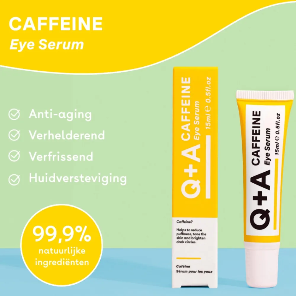 Het Q+A Caffeine Oogserum is een lichtgewicht oogserum dat speciaal is ontwikkeld om de vermoeide huid rond de ogen te revitaliseren en te versterken. Het bevat cafeïne, niacinamide en hyaluronzuur om de huid te hydrateren, te verstevigen en te kalmeren. Het is geschikt voor alle huidtypen.