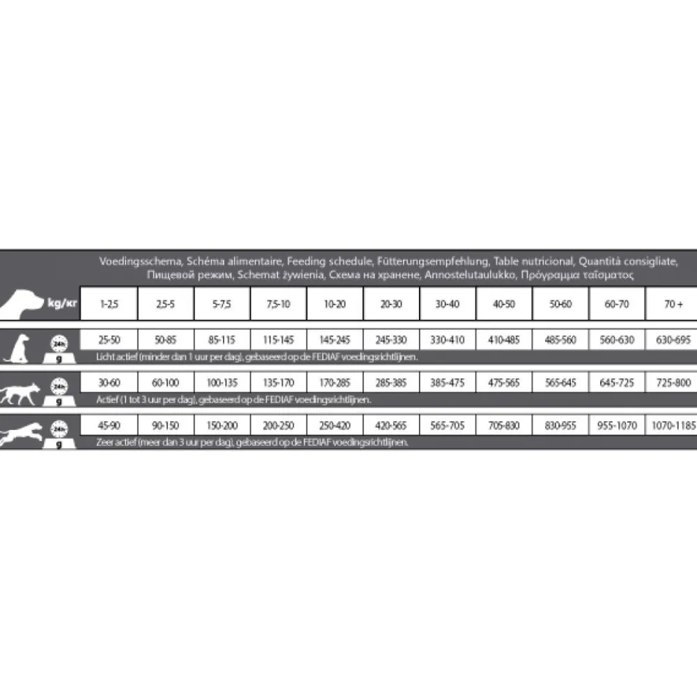 Het voerschema is gebaseerd op gemiddelden. Houd daarom altijd de conditie van je hond goed in de gaten en pas de hoeveelheid voer hier eventueel op aan of neem contact met ons op voor advies. Zorg ervoor dat er altijd vers en schoon drinkwater beschikbaar is.