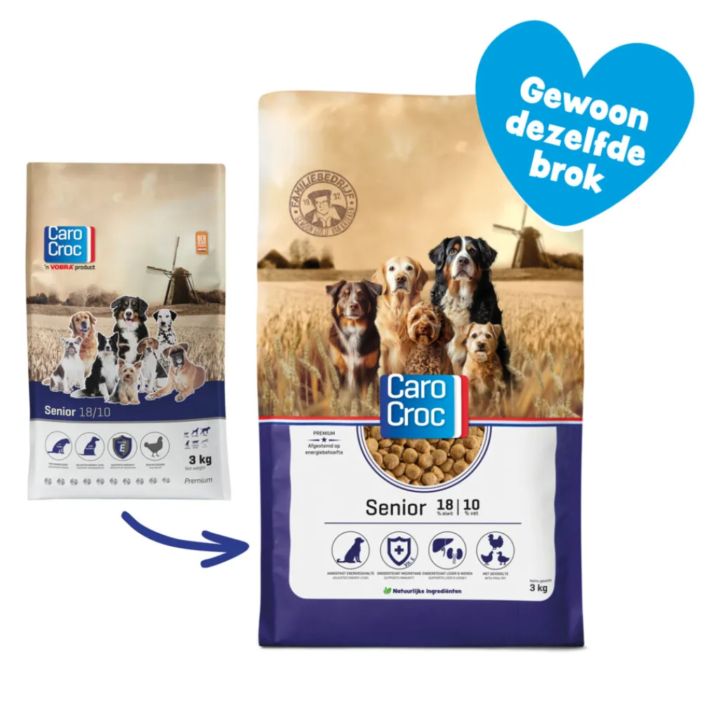 CaroCroc Senior voeding is speciaal afgestemd op jouw senior hond. Vanaf 7 jaar kan jouw hond verouderingsverschijnselen vertonen. De stofwisseling gaat trager werken en het activiteitsniveau kan afnemen. Dit betekenr dat de energiebehoefte van jouw hond verandert. Het is belangrijk om het voer hierop aan te passen.