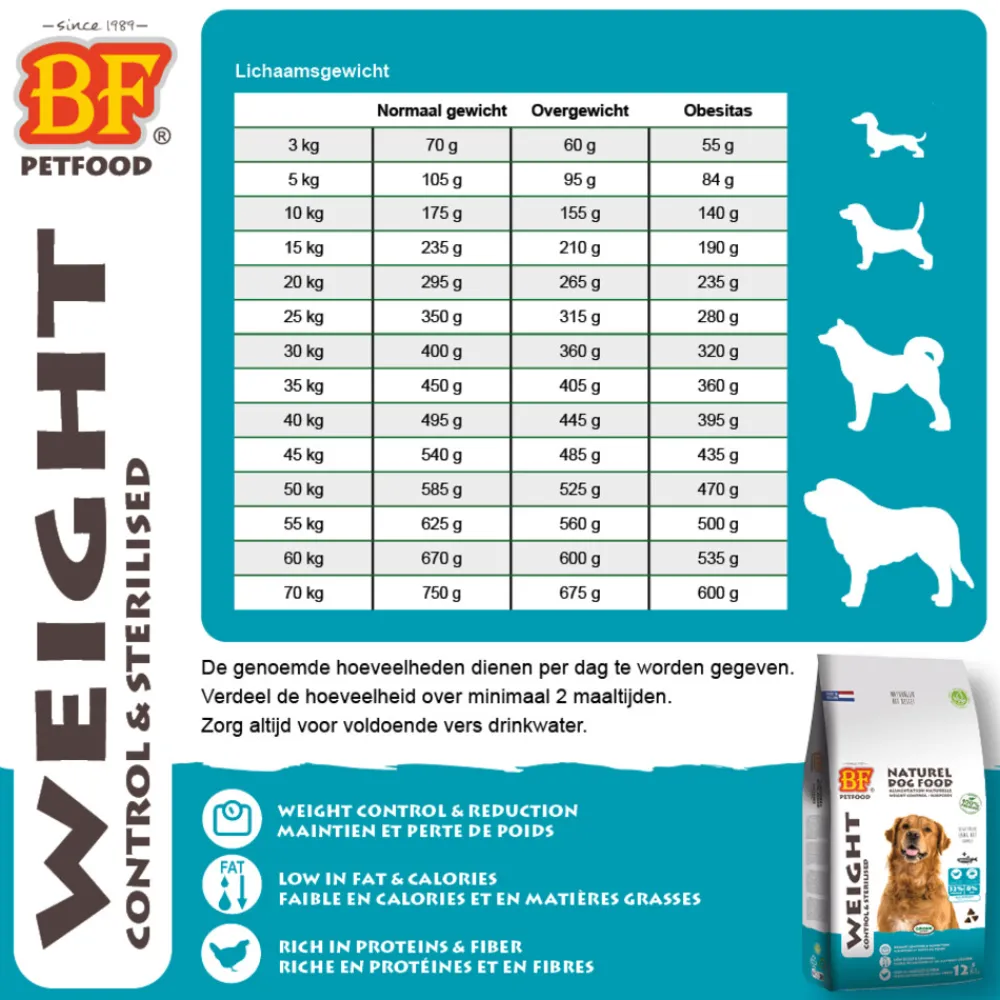 Biofood Weight Control Hondenvoer is speciaal ontwikkeld voor honden die een gezond gewicht moeten behouden of afvallen. Dit dieetvoer bevat een uitgebalanceerde hoeveelheid eiwitten, vetten en vezels, die helpen bij het bevorderen van een gezond metabolisme en het ondersteunen van gewichtsverlies zonder in te boeten op voedingsstoffen.