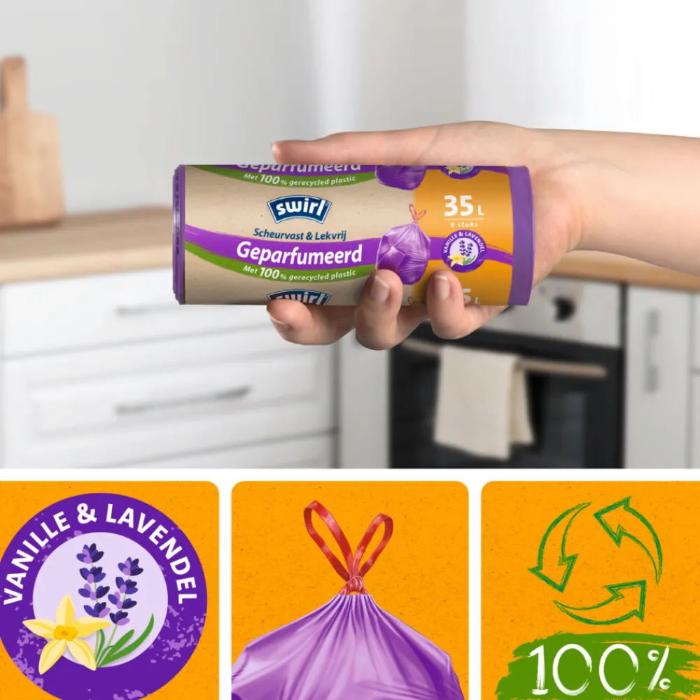 Swirl® Vanille-Lavendel Trekband 35L zijn geparfumeerde pedaalemmerzakken en verspreiden een frisse geur in de emmer en zorgen zodoende voor een aangenaam gevoel van fris- en netheid. De Vanille-Lavendel pedaalemmerzakken van Swirl® zijn scheurvast en waterdicht en gemaakt van minstens 80% gerecycled plastic en daarvan is minstens de helft (40%) afkomstig uit post-consumer plastic afval. De pedaalemmerzakken hebben een snel en praktisch sluitbare trekband daardoor deze gemakkelijk te dragen is.