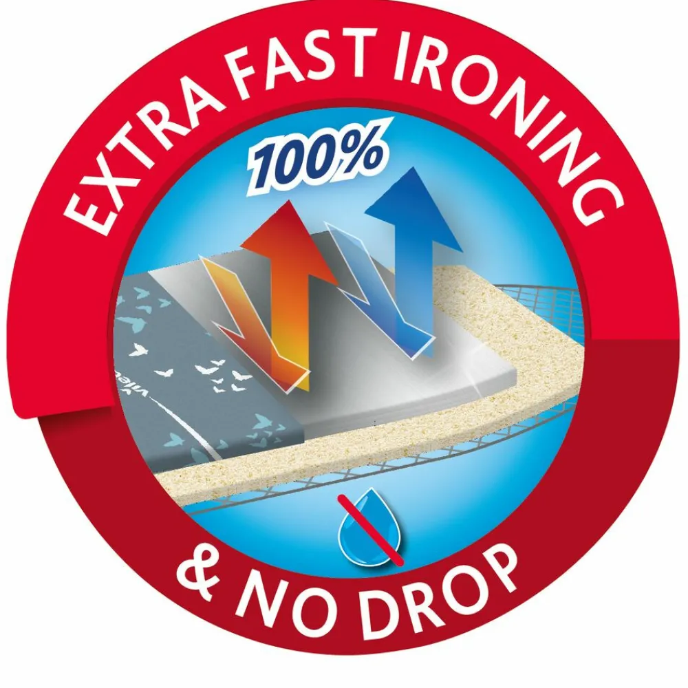 Ultra snel strijken met een perfect resultaat dankzij het systeem dat de hitte en de stoom voor 100% terugkaatst in het wasgoed door de 3 lagen en het 100% gemetalliseerde oppervlak. Geen condensvorming waardoor de vloer droog blijft!