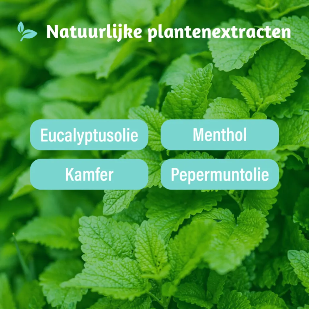 Samenstelling: Eucalyptus olie, menthol, kamfer, pepermunt olie, antioxidant (tocoferol)
