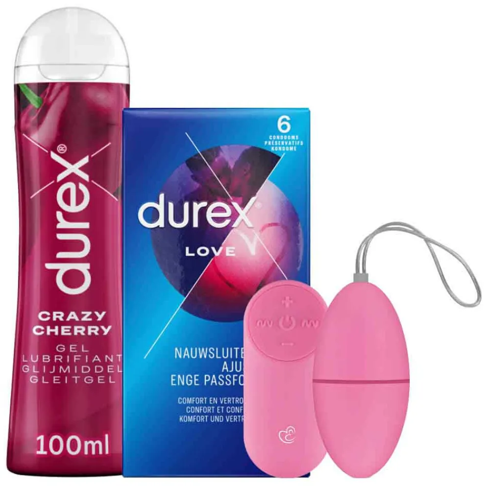 Met dit spannende Valentijn pakket kun jij je geliefde verrassen in de slaapkamer. Het pakket bevat één pakje Durex Love Condooms, één Durex Play Glijmiddel met de smaak Crazy Cherry én een Vibrerend Ei van Easytoys. De condooms zijn standaard Durex condooms en bevatten glijmiddel.