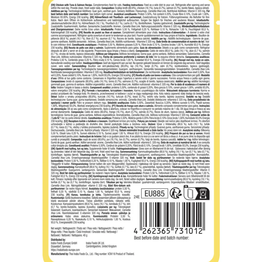Ciao Dashi Delights Silky Broth Kattenvoer Nat Chicken & Tuna & Salmon biedt jouw kat een onweerstaanbare smaakcombinatie. De Dashi-rijke bouillon is gevuld met malse kipreepjes, vergezeld van de delicate smaken van tonijn en zalm. Deze unieke Umami-smaak maakt elke slok een echte traktatie. Het aanvullend natvoer is verpakt in een handige doypack, die de versheid behoudt voor een optimale eetervaring. Geef je kat een luxe moment met deze heerlijke mix van kip, tonijn en zalm, die haar zeker zal verwennen.