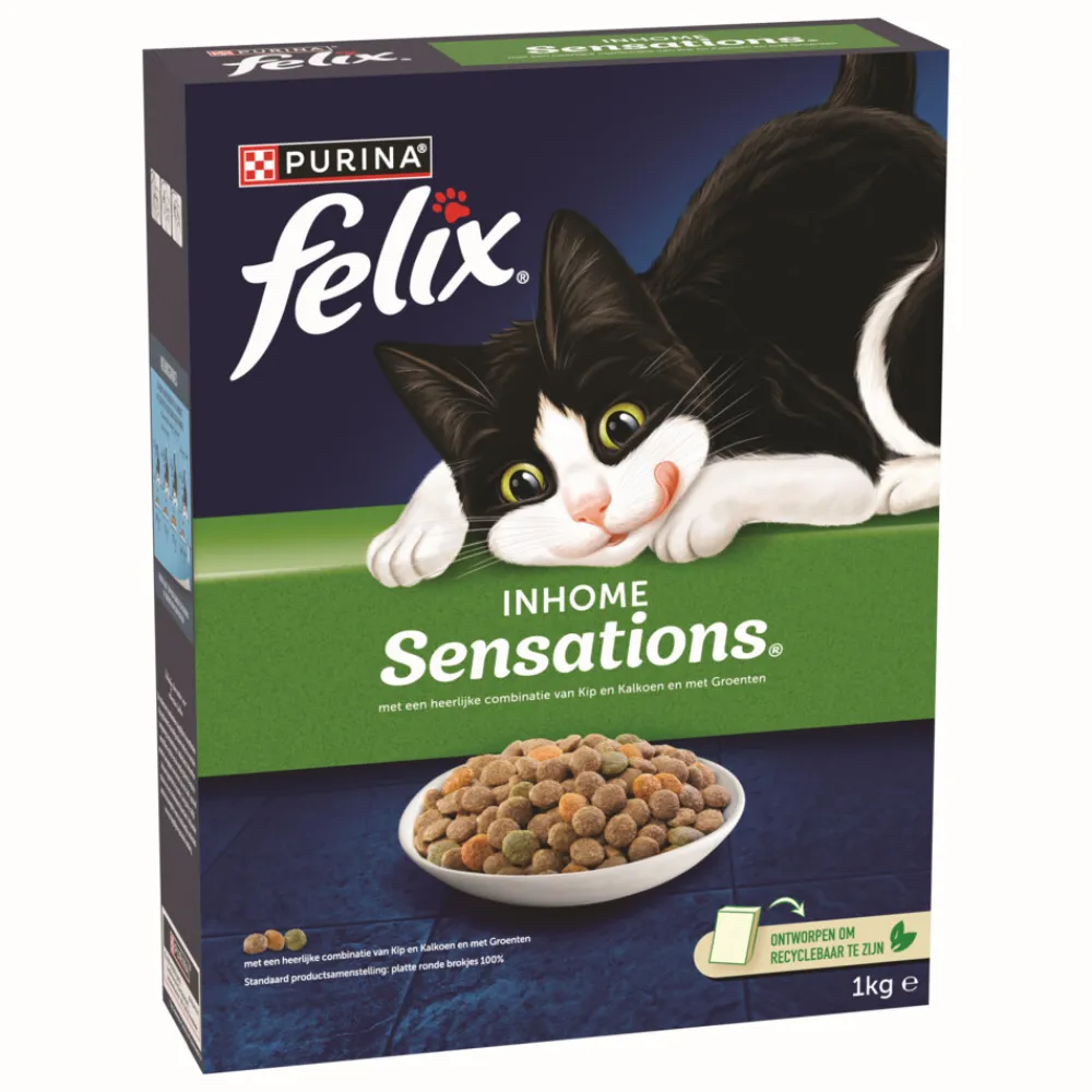 Felix Kattenvoer Droog Inhome Sensations biedt jouw kat een onweerstaanbare smaakervaring die hem laat spinnen van genot. Met een zorgvuldig samengestelde mix van smaken en texturen is dit voer speciaal ontworpen om aan de behoeften van jouw geliefde huisdier te voldoen. Elke hap zit boordevol voedingsstoffen die bijdragen aan een gezonde levensstijl en een glanzende vacht. Felix begrijpt dat jouw kat uniek is, daarom is dit voer geschikt voor katten van alle leeftijden en rassen.