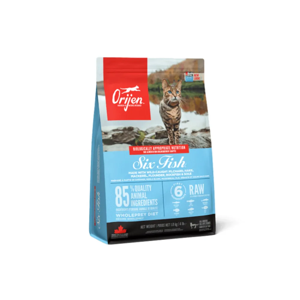 Orijen Six Fish kattenvoer is bereid met ongeëvenaarde ingrediënten van wilde en duurzaam gevangen vis uit Canada’s koude North Pacific wateren, dagelijks vers en in zijn geheel geleverd, rijk aan voedingsto en smaak. Met trots bereid in Orijen’s NorthStar® keukens, garandeert bekroonde Orijen je geliefde kat gezond, blij en sterk te houden. Lees de ingrediënten en Orijen denkt dat je het met Orijen eens zal zijn.