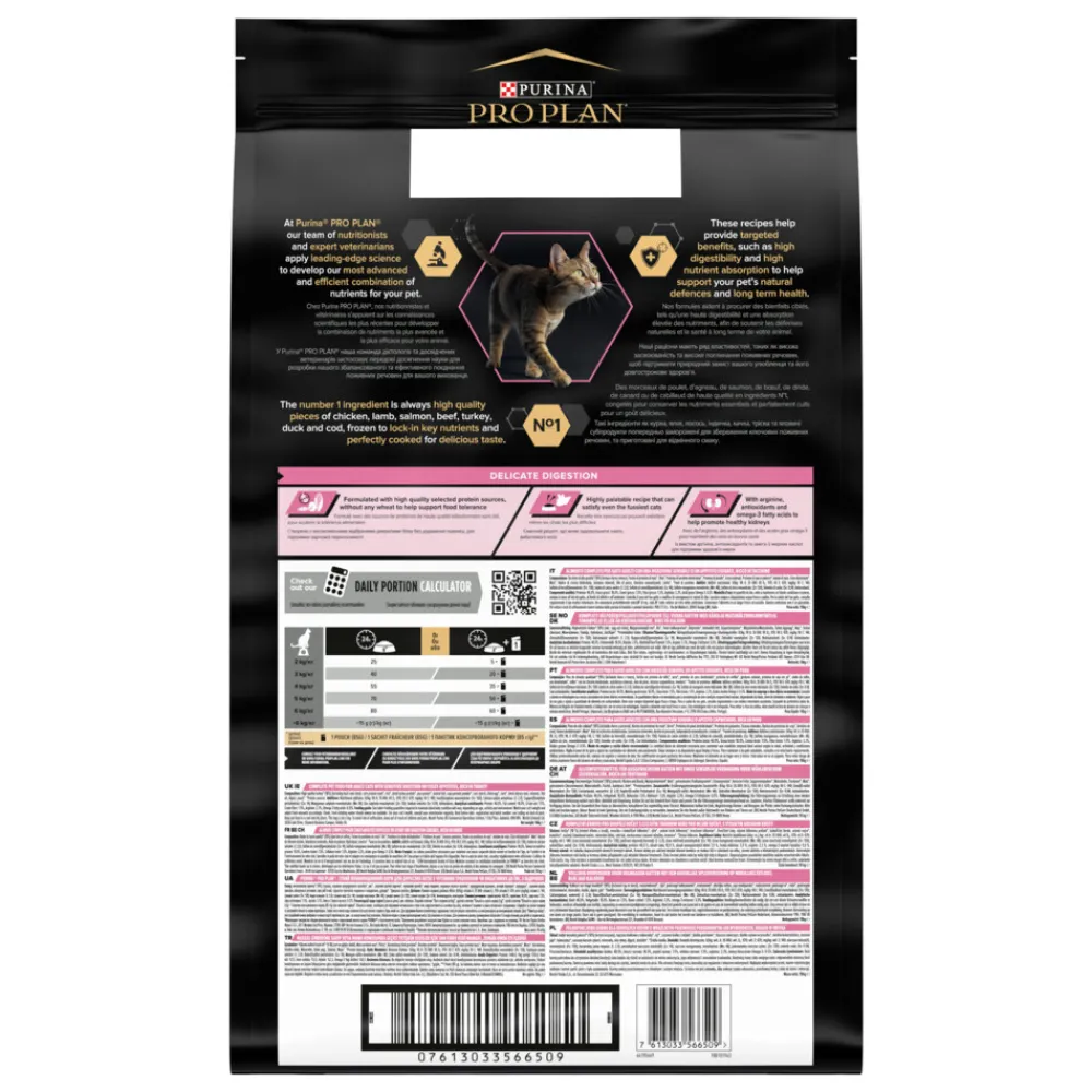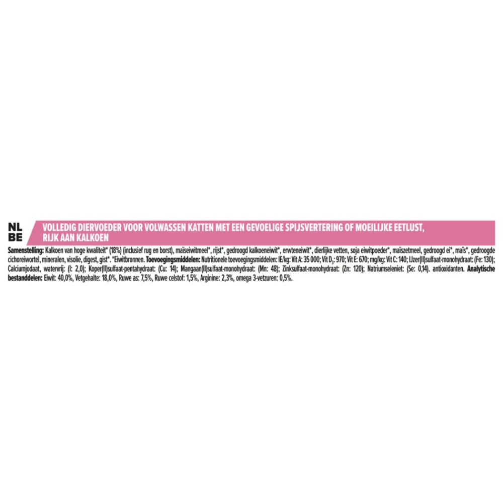 Pro Plan Adult Delicate Digestion Kalkoen (voorheen OptiDigest) is een volledige en droge voeding wetenschappelijk samengesteld voor volwassen katten met een gevoelige spijsvertering. De voeding bevat alle voedingsstoffen die jouw kat nodig heeft voor de dagelijkse vitaliteit en gezondheid op de lange termijn. Delicate Digestion, aantoonbare ondersteuning van een gezonde spijsvertering dankzij natuurlijke prebiotica.