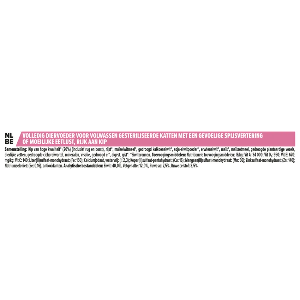 Pro Plan Adult Sterilised Delicate Digest Kip (voorheen OptiDigest) is een volledige en droge voeding wetenschappelijk samengesteld voor gesteriliseerde of gecastreerde volwassen katten. De voeding bevat alle voedingsstoffen die jouw kat nodig heeft voor de dagelijkse vitaliteit en gezondheid op de lange termijn. Delicate Digest, aantoonbare ondersteuning van een gezonde spijsvertering dankzij natuurlijke prebiotica.