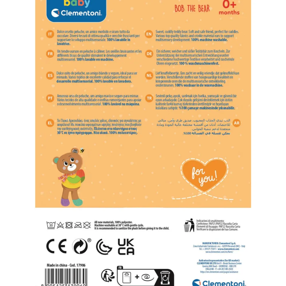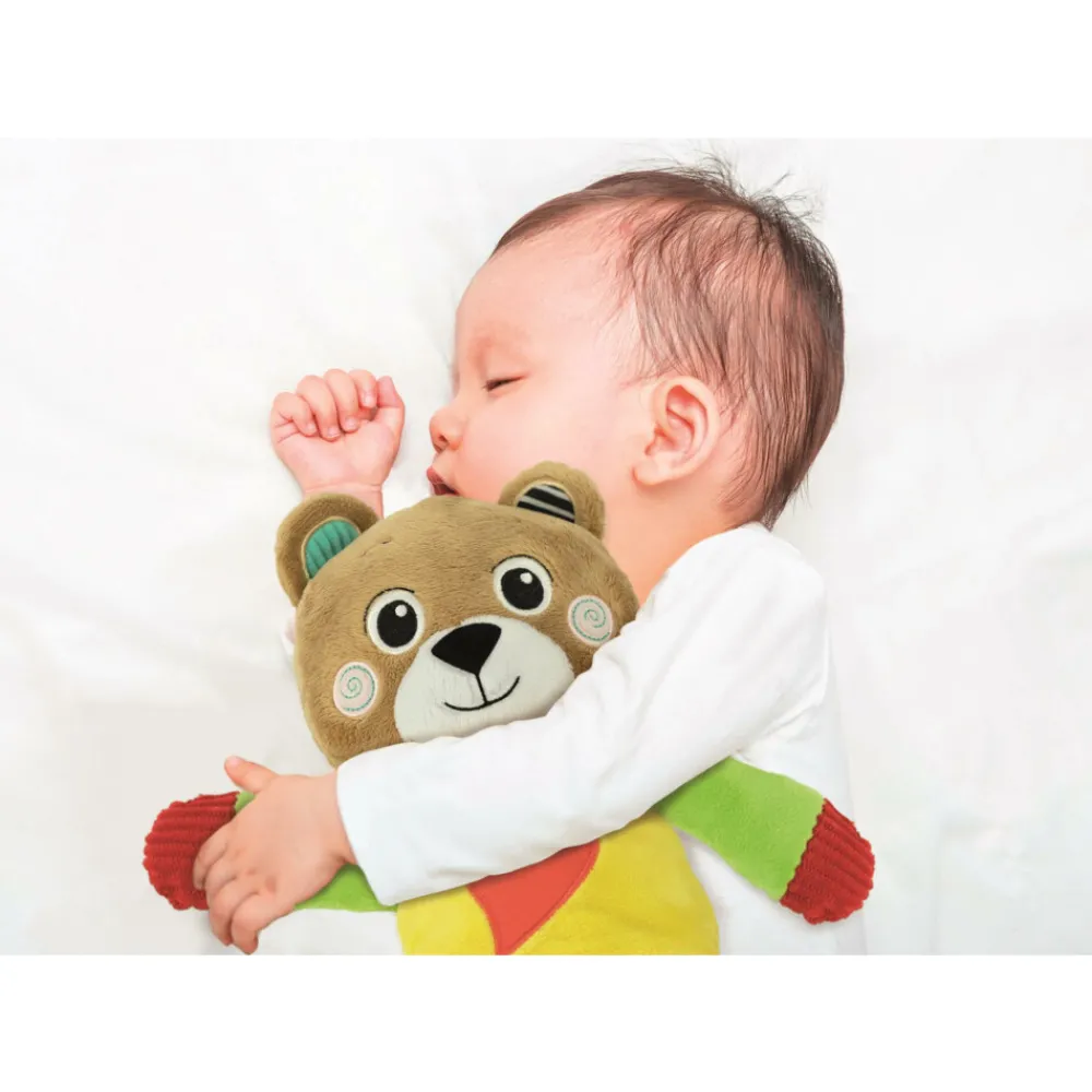 Een heel zachte knuffelbeer die vanaf de eerste levensmaanden een onafscheidelijke vriend zal worden van de allerkleinsten! De knuffel is gemaakt van verschillende materialen voor de multisensoriële stimulering van het kind en de ontwikkeling van zijn tastzin tijdens de eerste levensfasen. Het perfecte vriendje voor de ontwikkeling van het kind. De knuffel heeft een zacht, troostend dekentje, ontworpen om mama’s geur te absorberen en de baby gerust te stellen tijdens de scheidingsfase. Machinewasbaar.