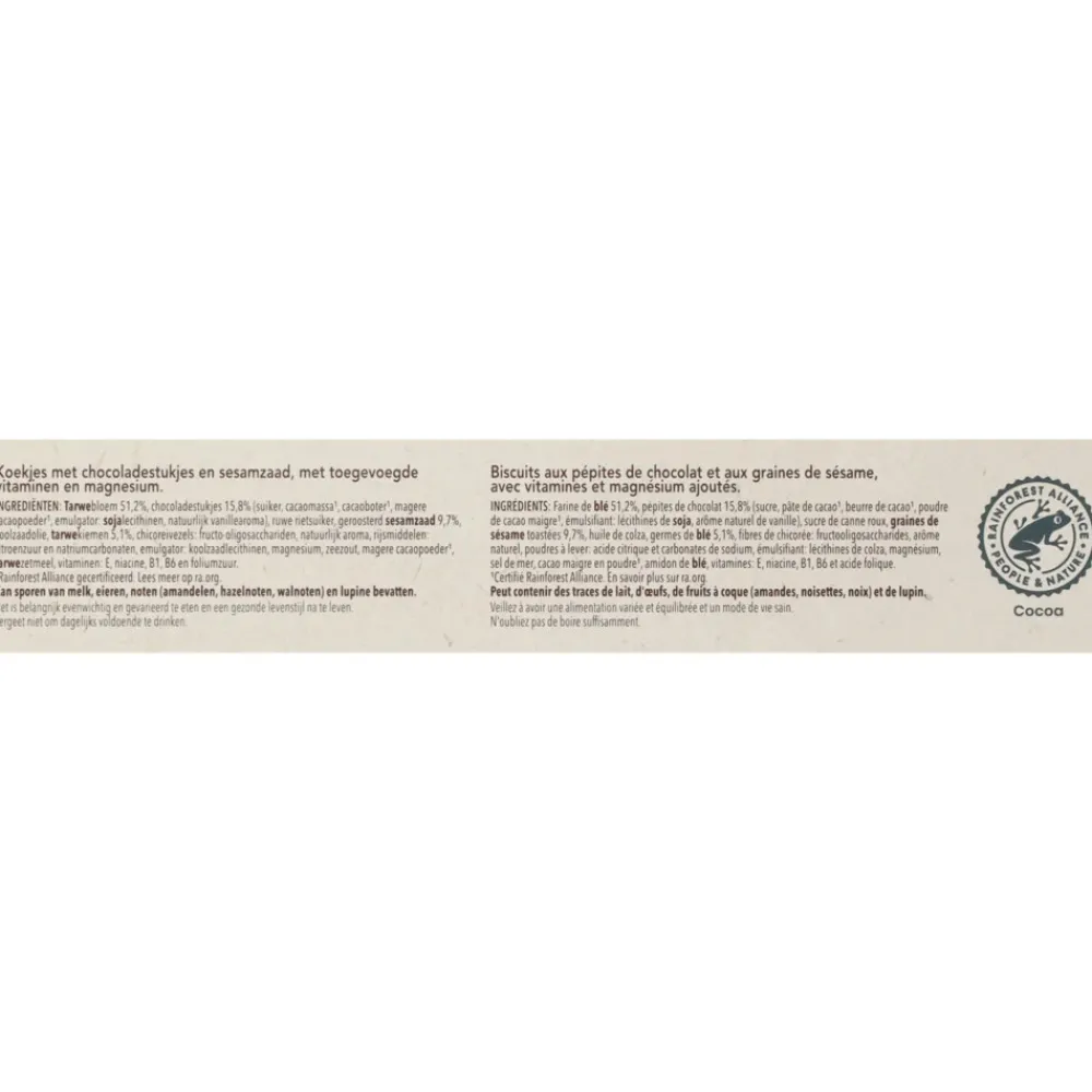 Céréal Koekjes Sesam Chocolade zijn koekjes met chocoladestukjes en sesamzaad, met toegevoegde vitaminen en magnesium.