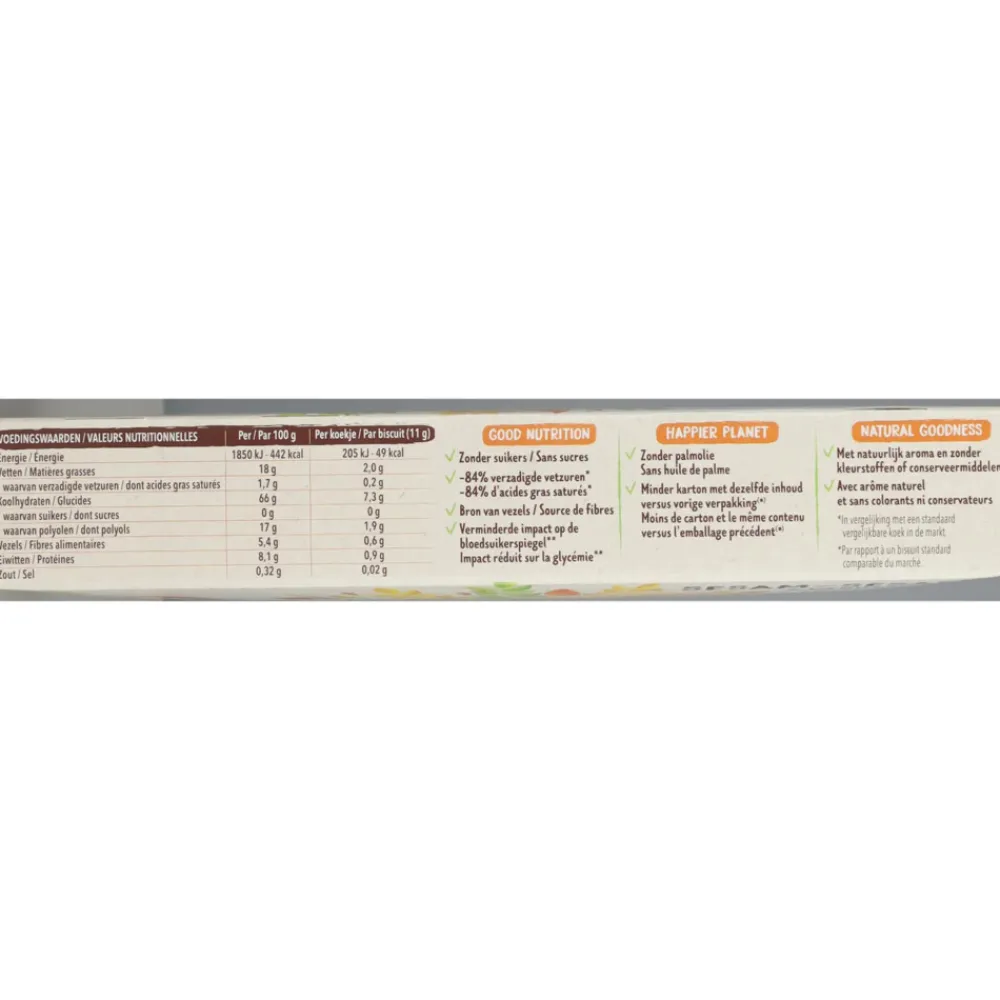 TARWEbloem 54,1%, zoetstof: maltitolen, koolzaadolie, TARWEzetmeel, geroosterde SESAMzaad 5,6%, TARWEvezels, zeezout, emulgator: koolzaadlecithinen, rijsmiddelen: citroenzuur en ammoniumcarbonaten, natuurlijke aroma