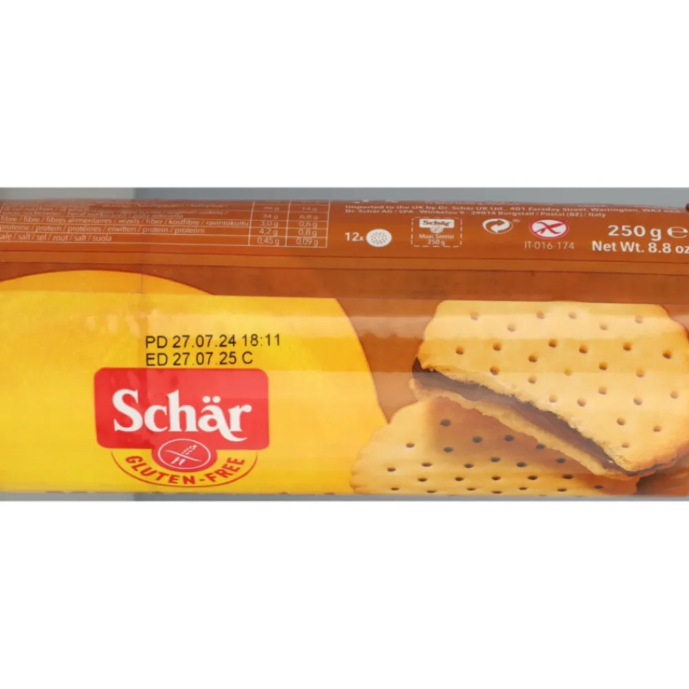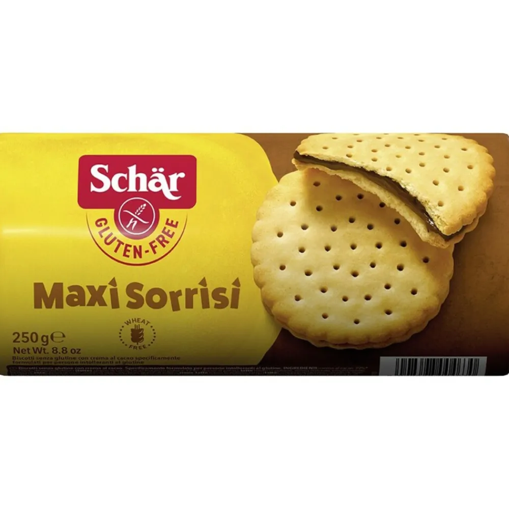 Schar Sorrisi Biscuit met Chocolade zijn heerlijke knapperige en glutenvrije knabbelkoekjes met daartussen een heerlijke vulling van chocoladecrème.