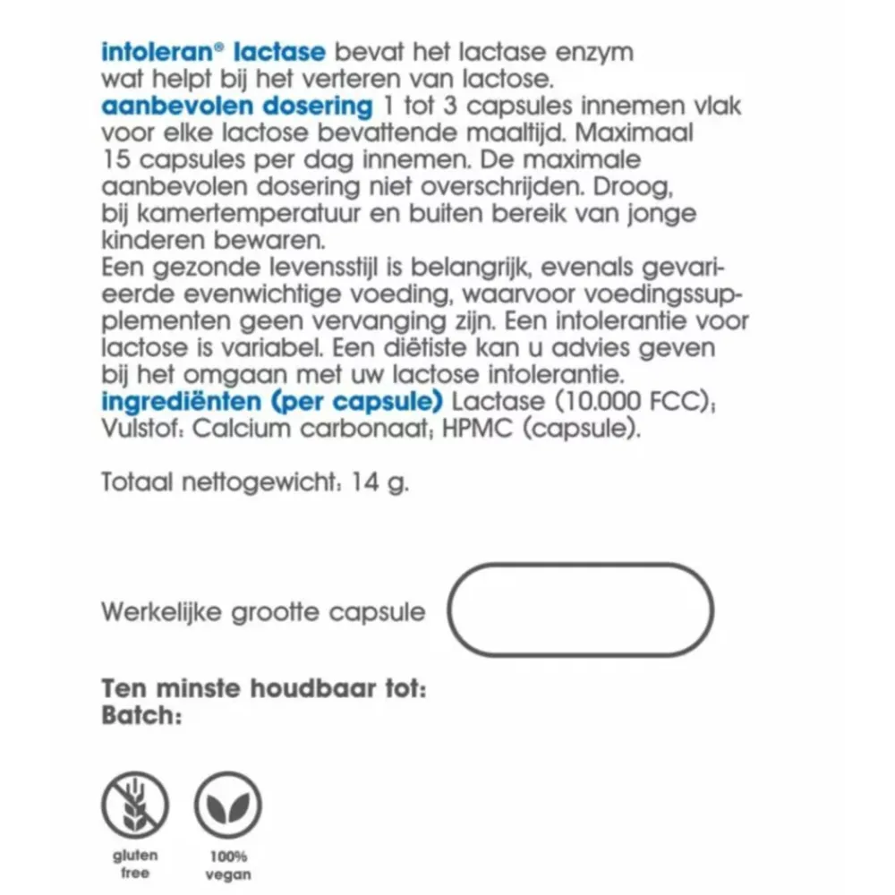 Ingrediënten: Lactase (10.000 FCC), Vulstof: Calcium carbonaat, HPMC (capsule).