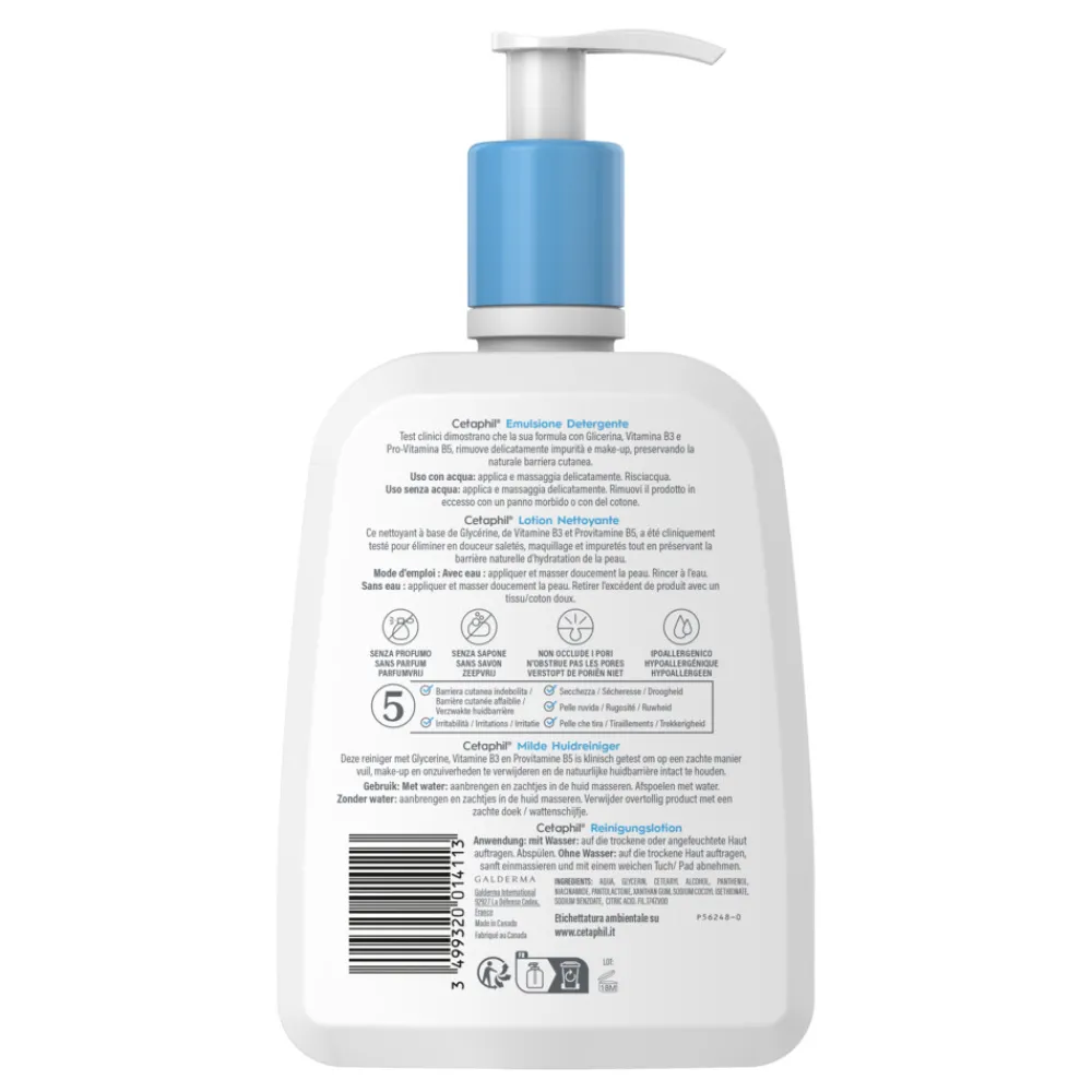Cetaphil Milde Huidreiniger met Glycerine, Vitamine B3 en Provitamine B5 is klinisch getest om op een zachte manier het lichaam en gezicht te reinigen. Geschikt voor alle huidtypes en ideaal voor de normale, gevoelige en droge huid. De milde maar effectieve reiniger reinigt de huid diep om vuil, make-up en onzuiverheden te verwijderen zonder de huid uit te drogen. Ook hydrateert en verzacht de reiniger de huid tijdens het reinigen om de natuurlijke vocht barrière van de huid te behouden, zonder dat het een residu achter te laat dat de poriën kan verstoppen.