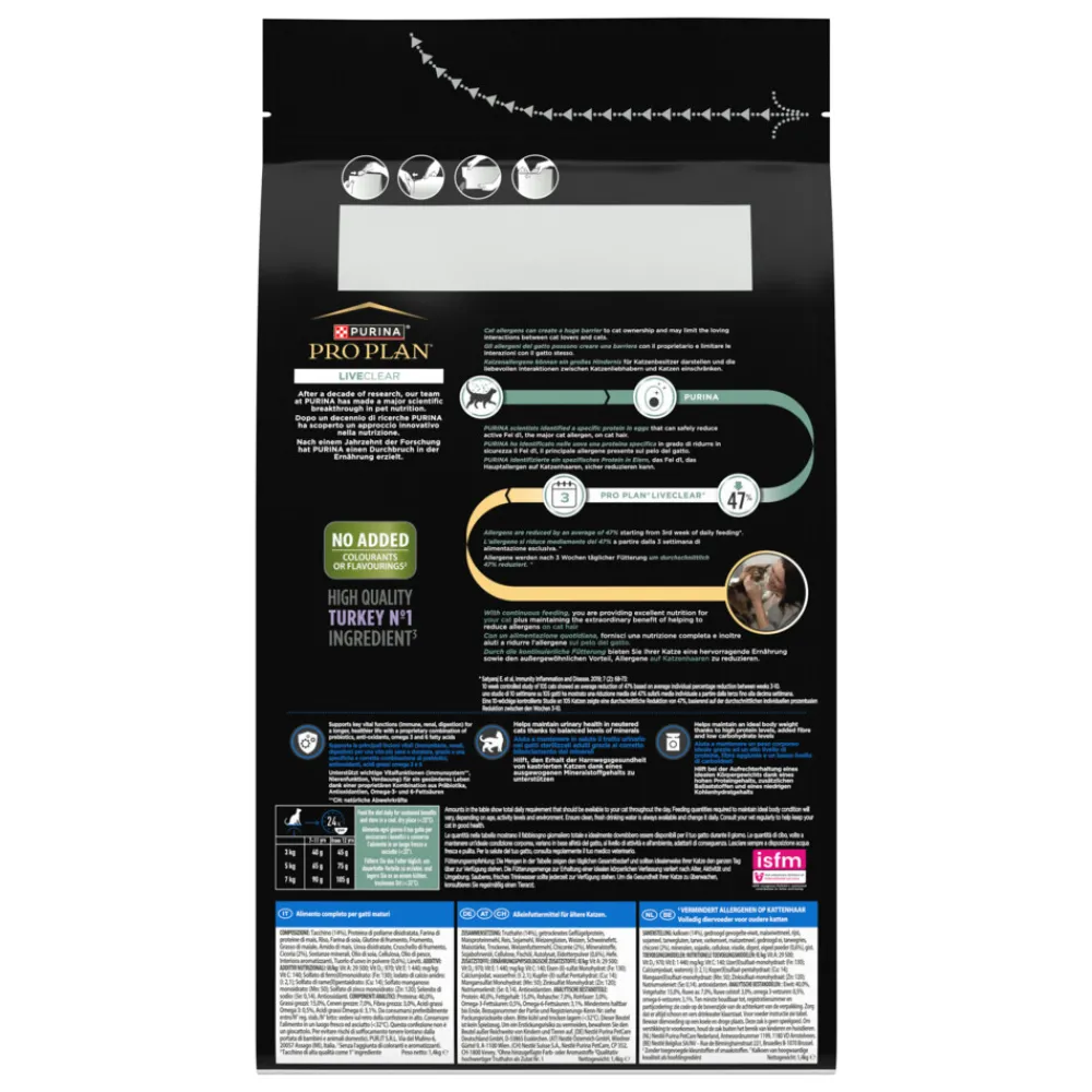 Pro Plan LiveClear diervoer voor gesteriliseerde of gecastreerde oudere katten is een smakelijke, 100% complete en evenwichtige premium dagelijkse voeding die de hoeveelheid allergenen op haar en huidschilfers van katten na drie weken dagelijks voeren veilig en effectief vermindert.