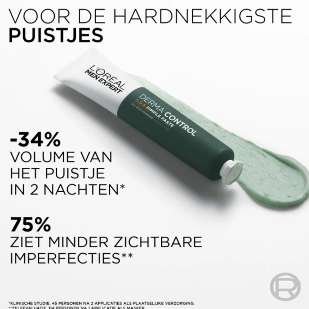L’Oréal Paris Men Expert Derma Control S.O.S. Pimple Paste is een crème die speciaal ontworpen is om puistjes aan te pakken. Hij kan gebruikt worden als zuiverend masker om zichtbare poriën te verminderen. De formule brengt de krachtige eigenschappen van niacinamide en salicylzuur samen om de talgproductie te reguleren en zo een doeltreffende oplossing te bieden tegen acne. Het resultaat: -34% volume van het puistje in 2 nachten, terwijl 75% van de gebruikers minder zichtbare imperfecties en volume van het puistje ziet. De lichte, romige textuur zorgt voor een moeiteloze applicatie zonder plakkerigheid.